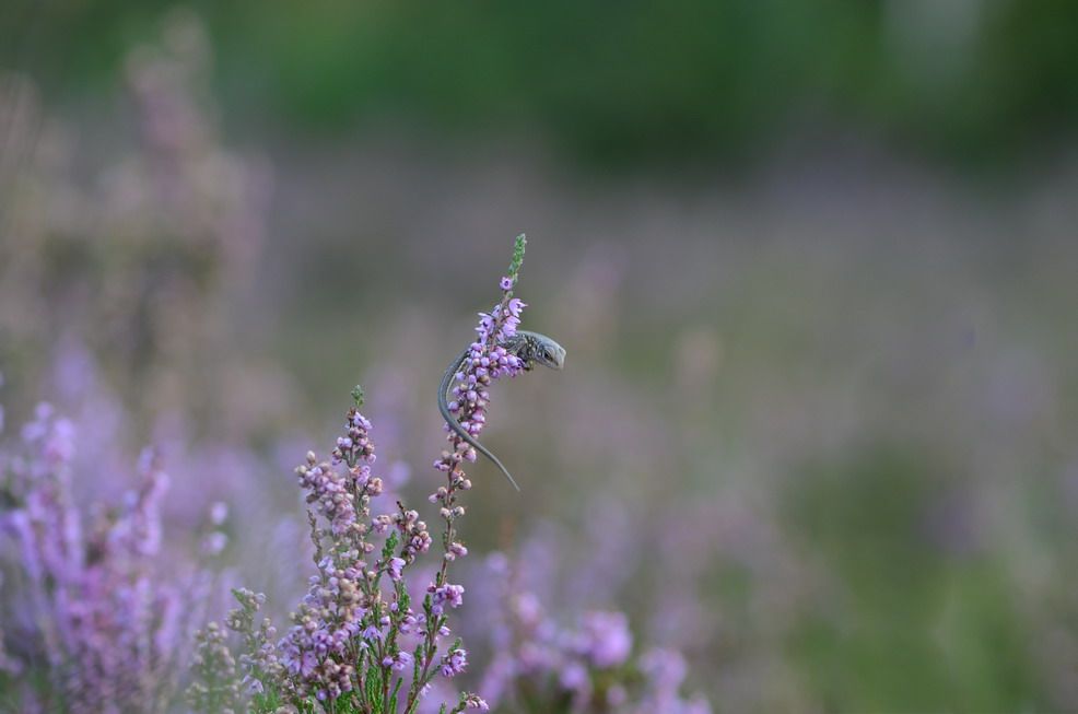 Хорошенькая :-) Удачно цветы вереска сочетаются с серым окрасом ящерки!