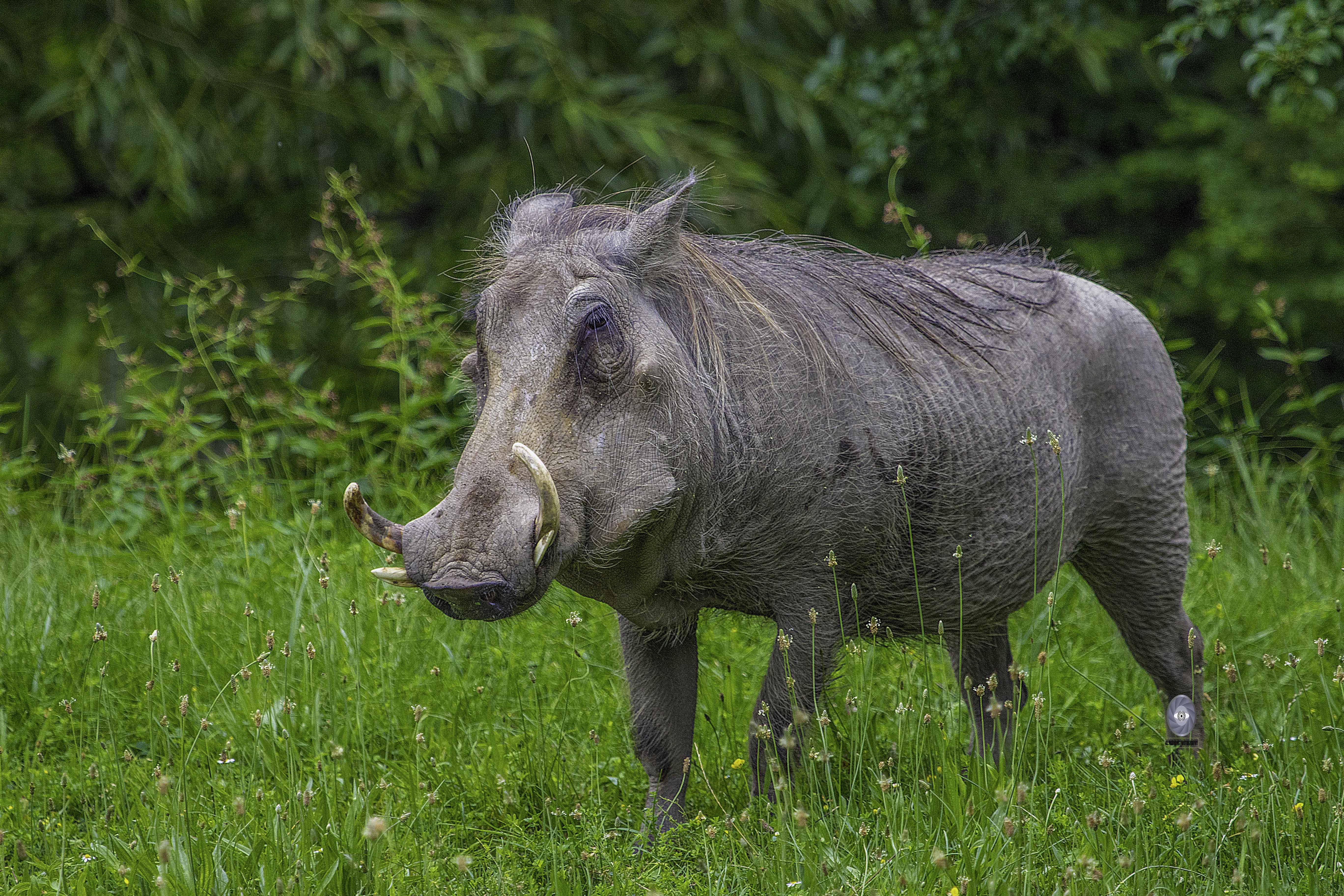 The warthog’s muscular body is a slate colour and almost hairless. A long thin mane of coarse hair extends from the nape to the middle of the back where it is broken by a bare space, and then continues on the rump. The remainder of the body is covered with bristles. The legs are remarkably slender for the size of the animal. The head is the warthog’s most prominent feature. It is large, flat, shovel shaped. The neck is very short and thick. Eyes are set high on the head. Warthogs have a typical pig's disc-like nose pad.