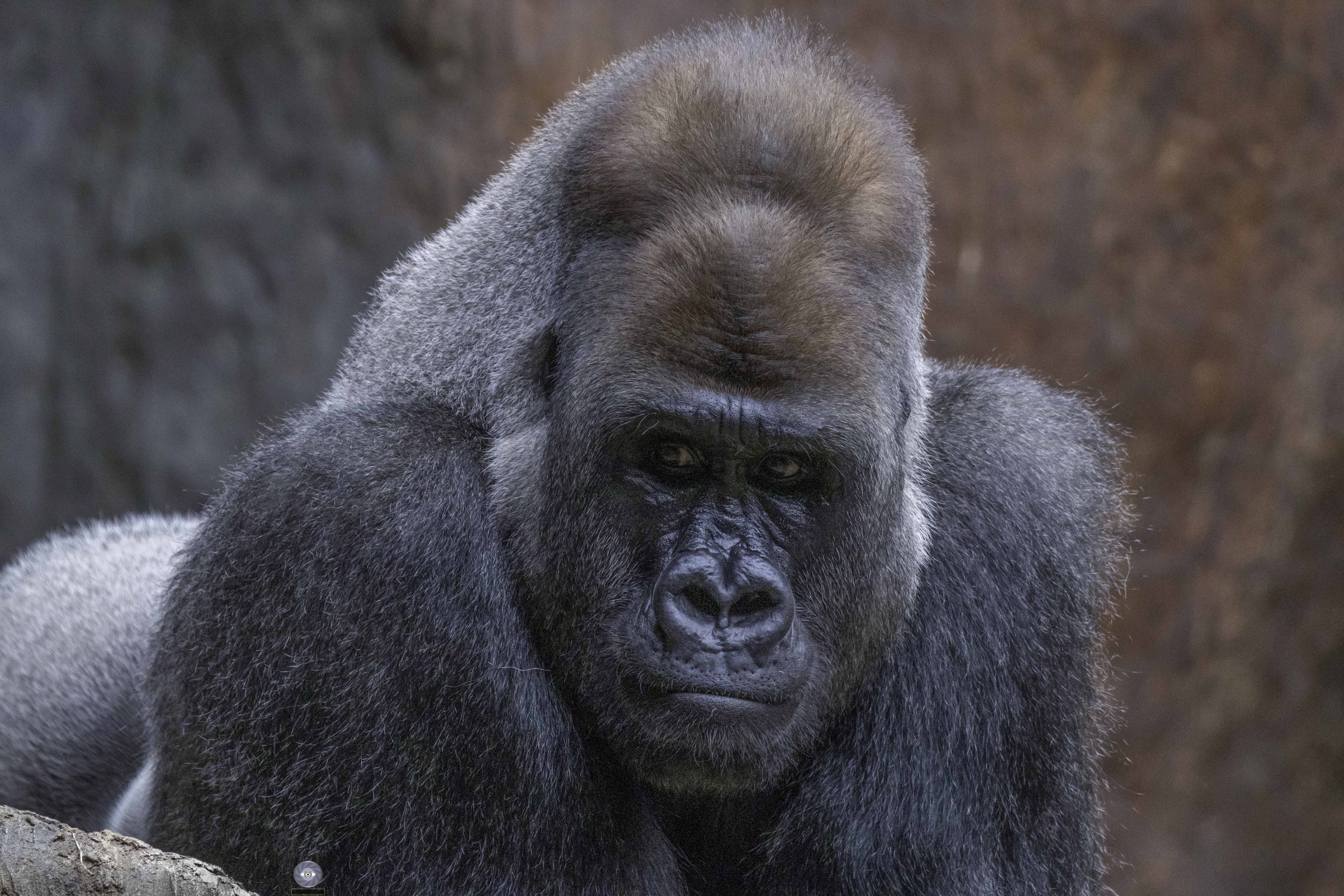 Gorillas are the largest of the primates. Western lowland gorillas are the smallest of the four sub-species. The males, on average, weigh approximately 135 - 220 kg and the females weigh about half of that, around 70 - 90 kg. They are sexually dimorphic. The male is very stocky and powerful in the body, with wide shoulders and chest. The females are much smaller and slimmer. Gorillas develop a “sagittal crest” which is a ridge of bone on top of their head. The male’s crest is more prominent than the female’s. The heavy muscled head and shoulder area of the adult male is what really identifies him in the wild from the female when only the head is showing. The nostrils are large and flaring, the ears small and close to the head, the eyes are wide set and expressive. The muscular arms are longer than the short thick legs, and the broad hands are equipped with short fingers and thumbs.