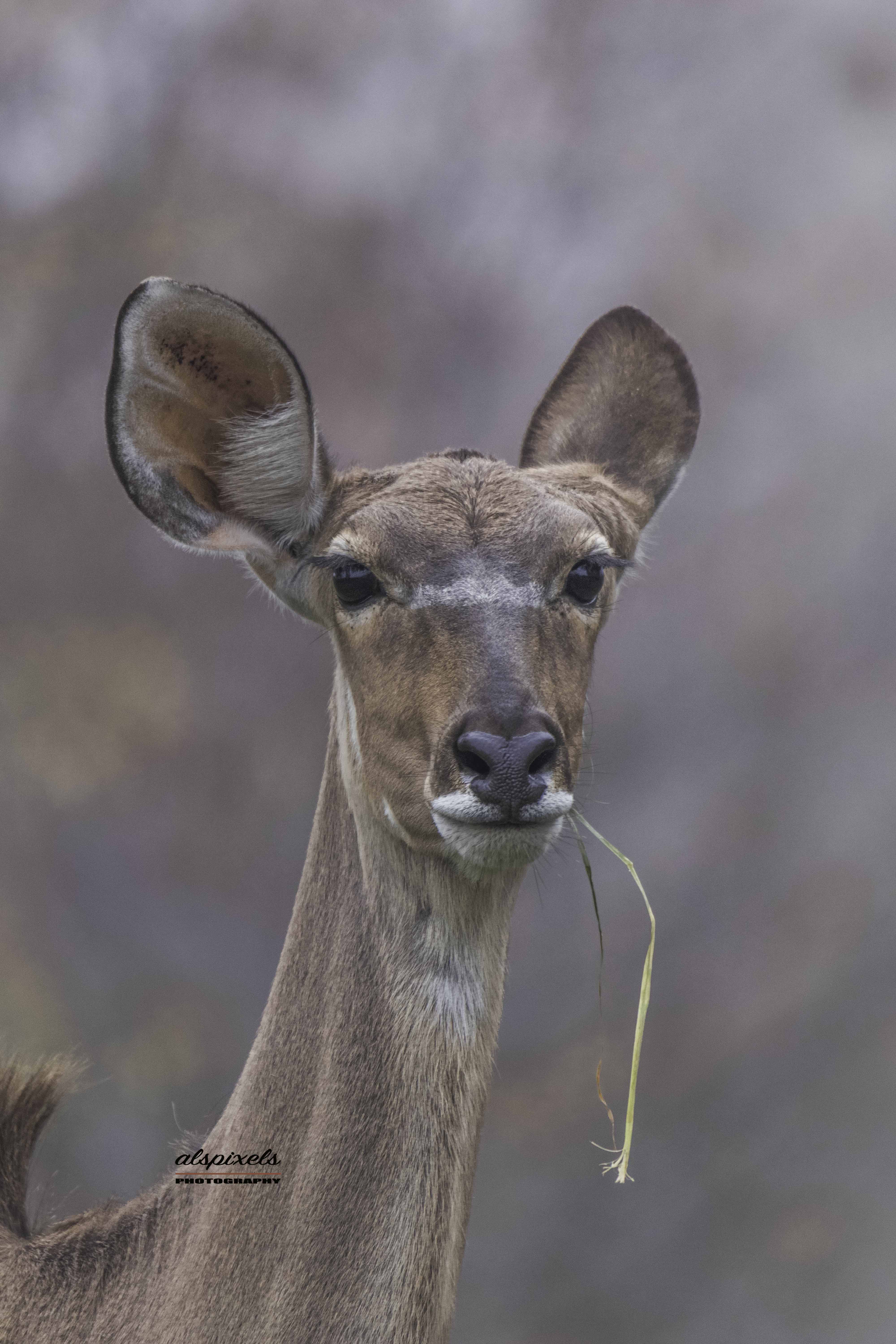 The greater kudu is the second largest of the antelopes, the eland being the largest. Kudu show strong sexual dimorphism. The curved horns of the male are this species most impressive feature, growing up to 180 cm with at least two and a half turns, compared to one and a half turns in related species. The average length is 120 cm with a record of 187.64 cm. These long spiraled horns slant back from the head. The young male horns begin to grow at 6 - 12 months of age, twisting once at about two years of age and reaching two and a half twists at about six years of age, which is when the horns grow to their full length. Females do not have horns. Bulls also attain much larger sizes than cows, and have a tasseled dewlap.