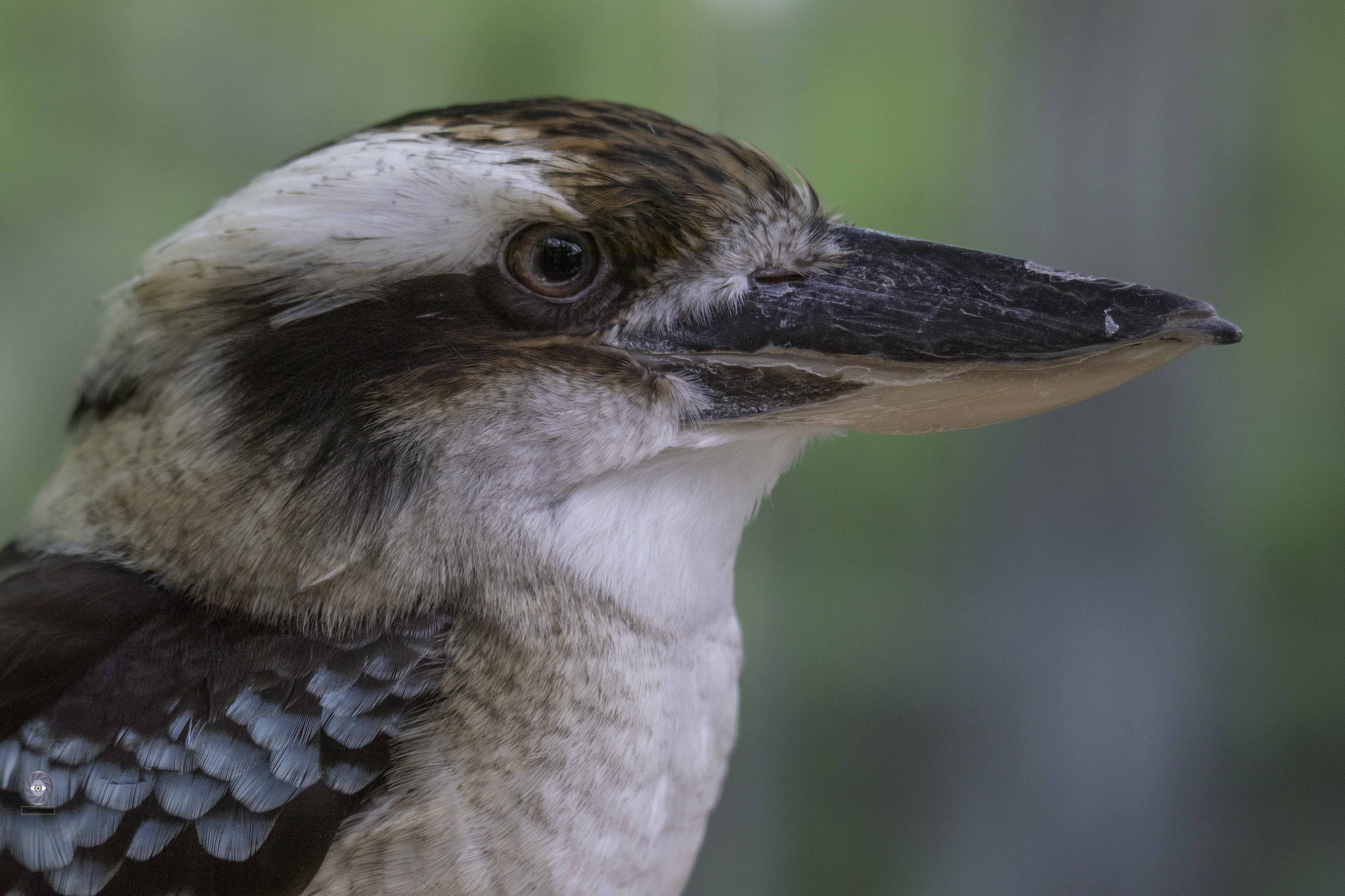 Смеющаяся кукабарра имеет характерную широкую коричневатую бровь, которая начинается над клювом и сужается за макушкой. Голова квадратной формы, а клюв сужается книзу в острый кончик. Как и зимородок, кукабарра имеет длинный костный гребень и сильные шейные мышцы вдоль задней части черепа. Хотя она и не ныряющая птица, она принадлежит к тому же семейству, что и зимородок. Перья крыльев сине-коричневые, а нижние слои перьев белые. Перья хвоста серо-коричневые, с белыми концами и коричневым полосатым рисунком. Большой, сильный клюв черный сверху и светлый снизу. Он около 45 см в длину и весит 0,5 кг.