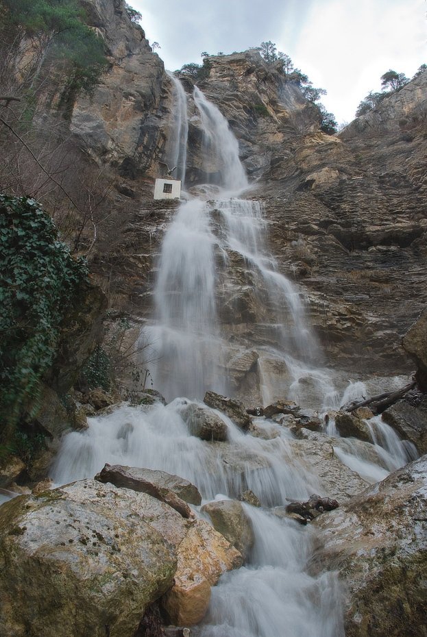 Ага! :) Это шлюз Леонид. Наверху, справа от шлюзовой небольшая плотинка и когда водопад полноводный вода направляется через шлюз, далее по трубе, которая идёт лесом к водохранилищу на горе Магаби, километрах в пяти отсюда. Водохранилище питает Ялту. А орёл просто украшение, дань моде 50-60 годов. Спасибо, рад вниманию!