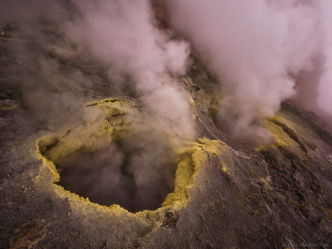 Россия, Камчатка, Мутновский вулкан, кратер. Дыхание фумарол. Там так воняет тухлыми яйцами, что слабонервным лучше не ходить. Но, если вы принюхаетесь и сможете с собой совладать, то получите потрясающие снимки. Оно того стоит!