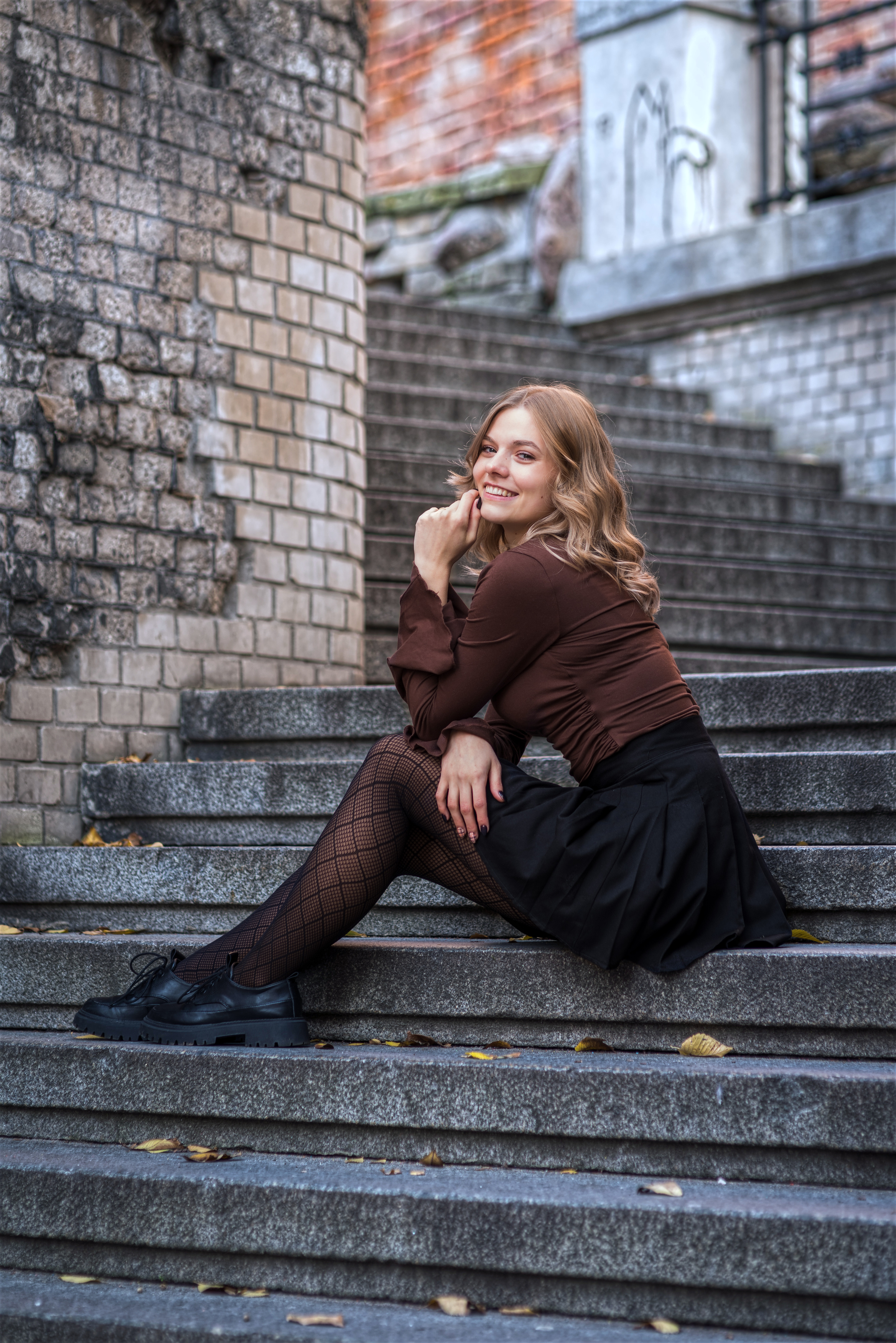 Nice light, Maciej — the way the soft daylight hits her face and the texture of the brick behind her gives the shot a quiet, almost nostalgic feel. She’s relaxed, natural, and the pose feels effortless. I like how the steps lead the eye and the scattered leaves add a touch of season. The outfit’s rich tones work well with the urban backdrop.