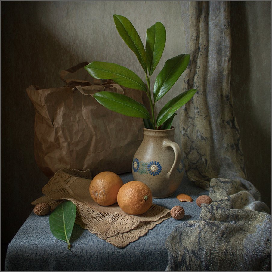 Что-то милое, южное навеяла эта работа- веточка плотных листьев,-то ли магнолии, то-ли олеандра,фрукты, лёгкая шаль. Но интрига- в бумажном пакете, который автор только-что принёс с южного базара, и вот там то и содержится,возможно, самое заманчивое. Интересно!
