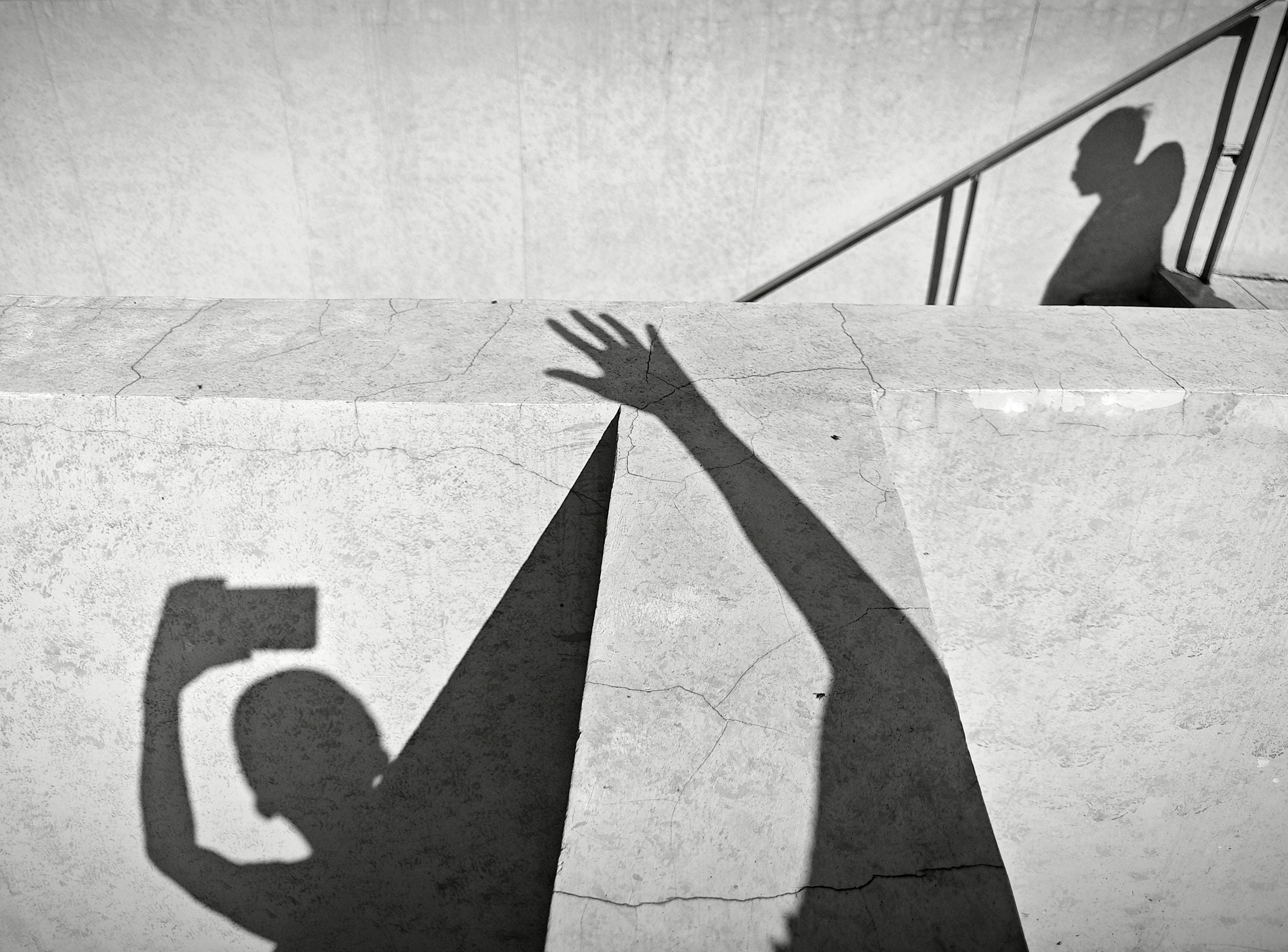 Interesting play with shadows and geometry here — the way the two figures interact across the concrete divide feels almost cinematic. The hand reaching up, the silhouette holding the camera… it’s got a quiet tension, like a moment caught between worlds. The textures in the concrete add grit, and the black-and-white choice keeps it raw and focused.