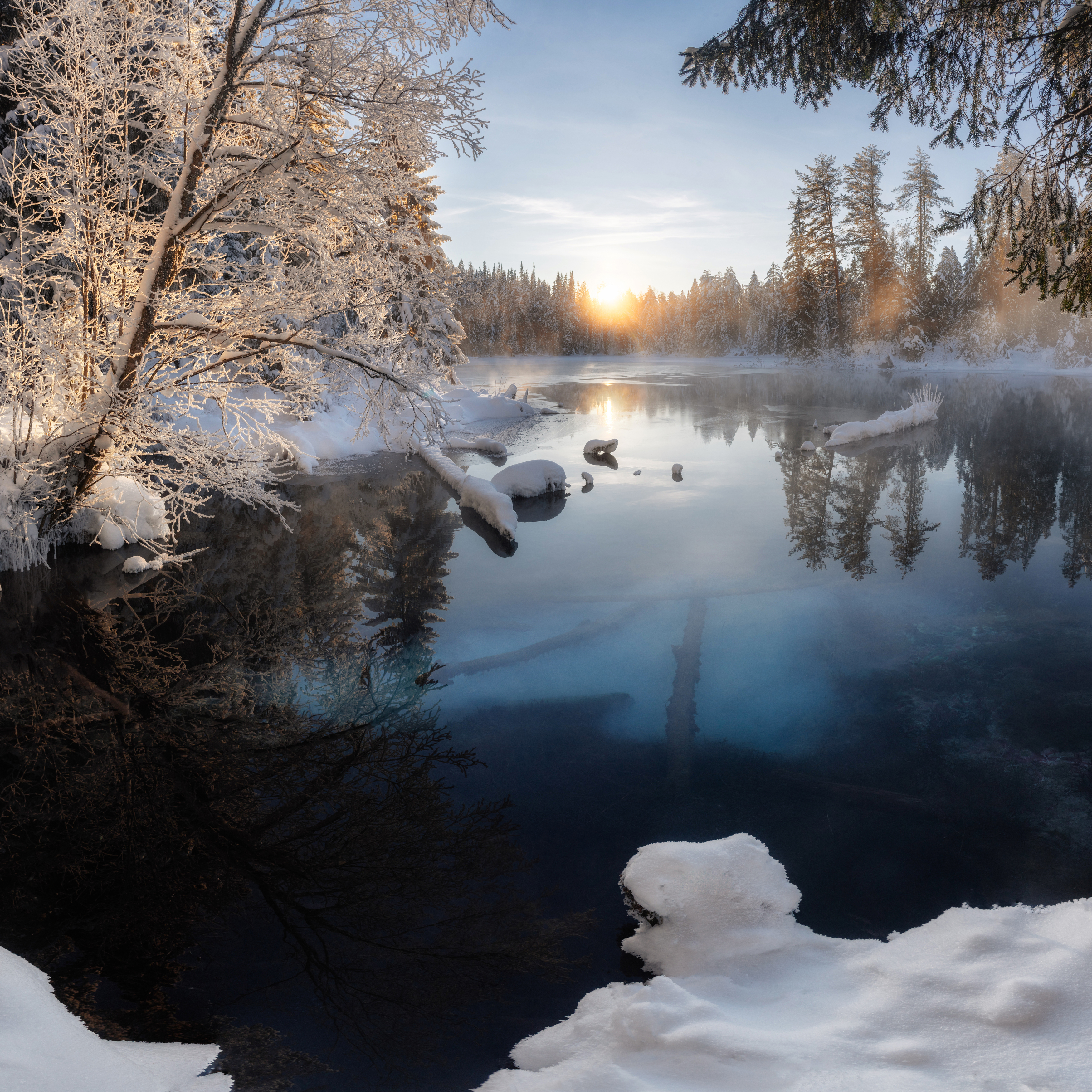 На краю леса, где снег укутывает деревья, а лёд на озере держит отражение неба, — тишина, пронизанная светом. Солнце, только что взошедшее, окрашивает верхушки сосен в золотистый свет, а вода, несмотря на мороз, остаётся почти жидкой, словно хранит в себе тепло прошлого дня. Это место, где время замедляется, и каждый вдох — как прикосновение к чистоте. Андрей Малыгин запечатлел мгновение, когда зима и свет встречаются в гармонии.