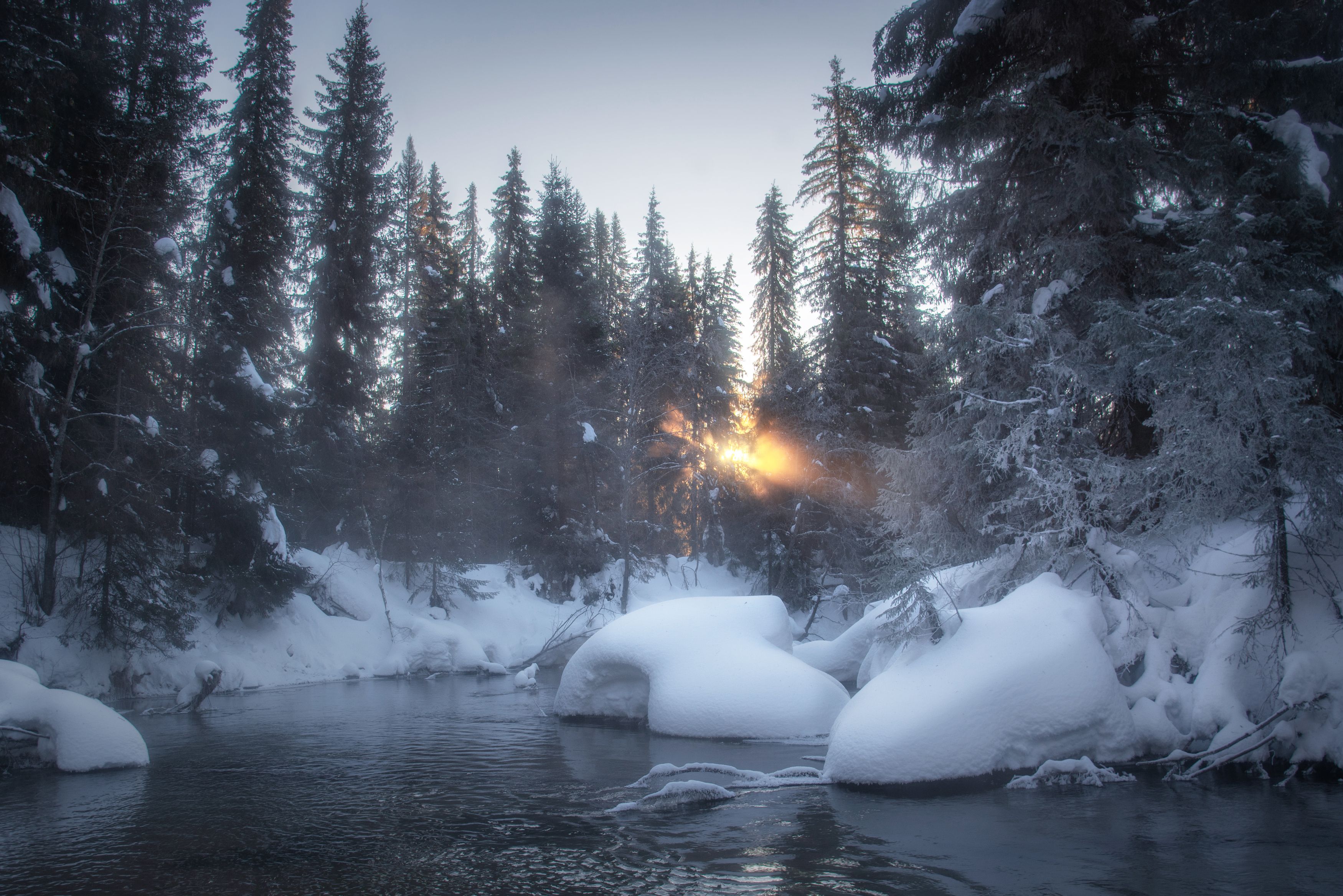 Спасибо, Андрей. Фотография передаёт холод и спокойствие зимнего леса — свет пробивается сквозь снеговые ветви, а река течёт, словно в сне. 🌲❄️
