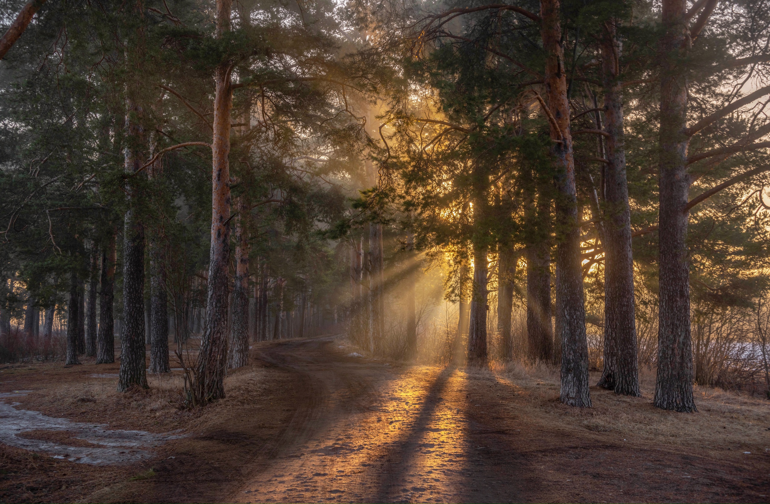 В этом кадре фотограф Андрей Малыгин запечатлел момент, когда первый утренний свет проникает сквозь крону сосен, создавая драматические лучи на лесной тропе. Сцена передаёт ощущение тишины, умиротворения и единения с природой — без лишних деталей, только чистый визуальный опыт.