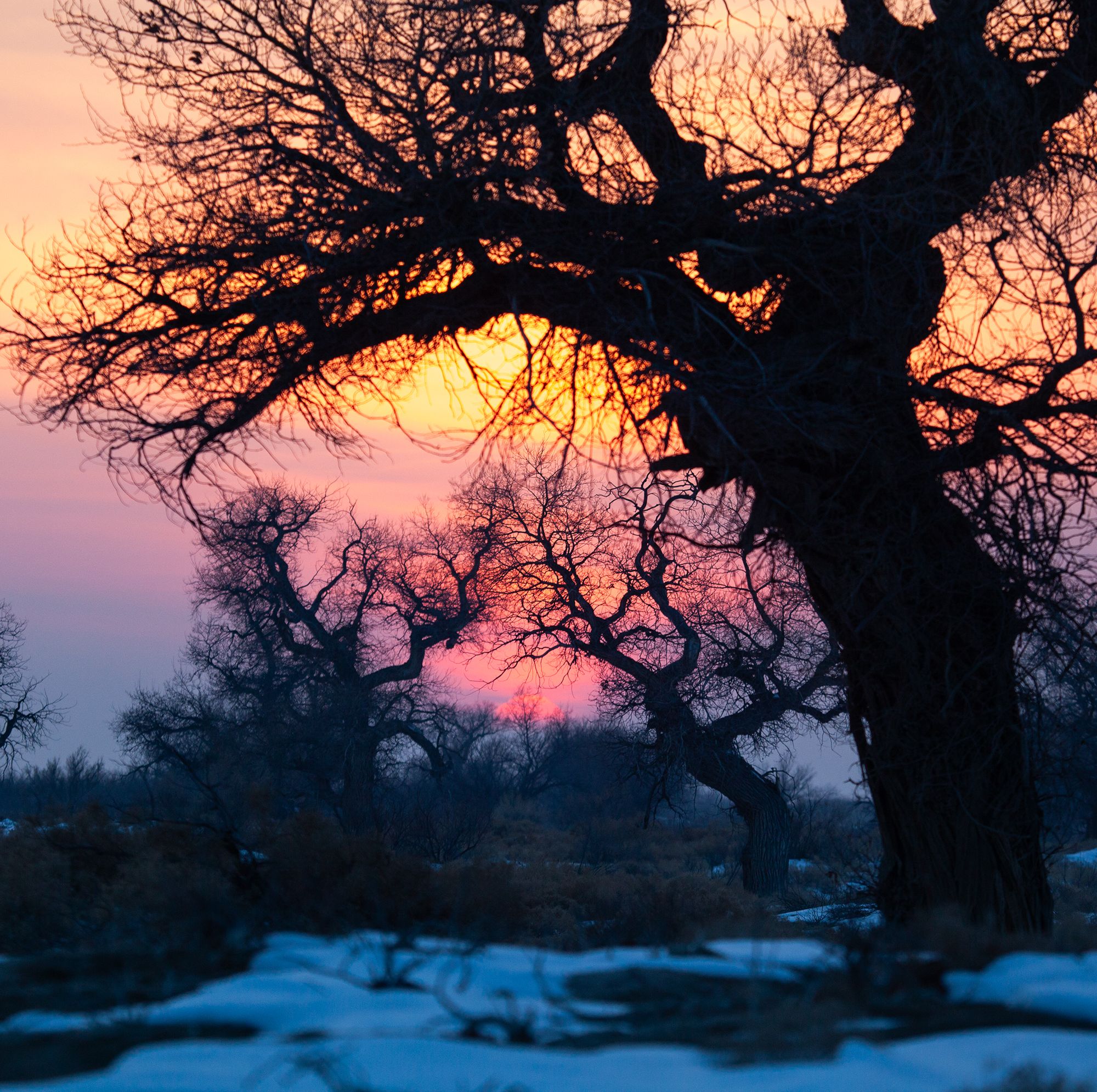 казахстан, деревья, закат, туранга, зима, красный закат, Andrey Shishkalov