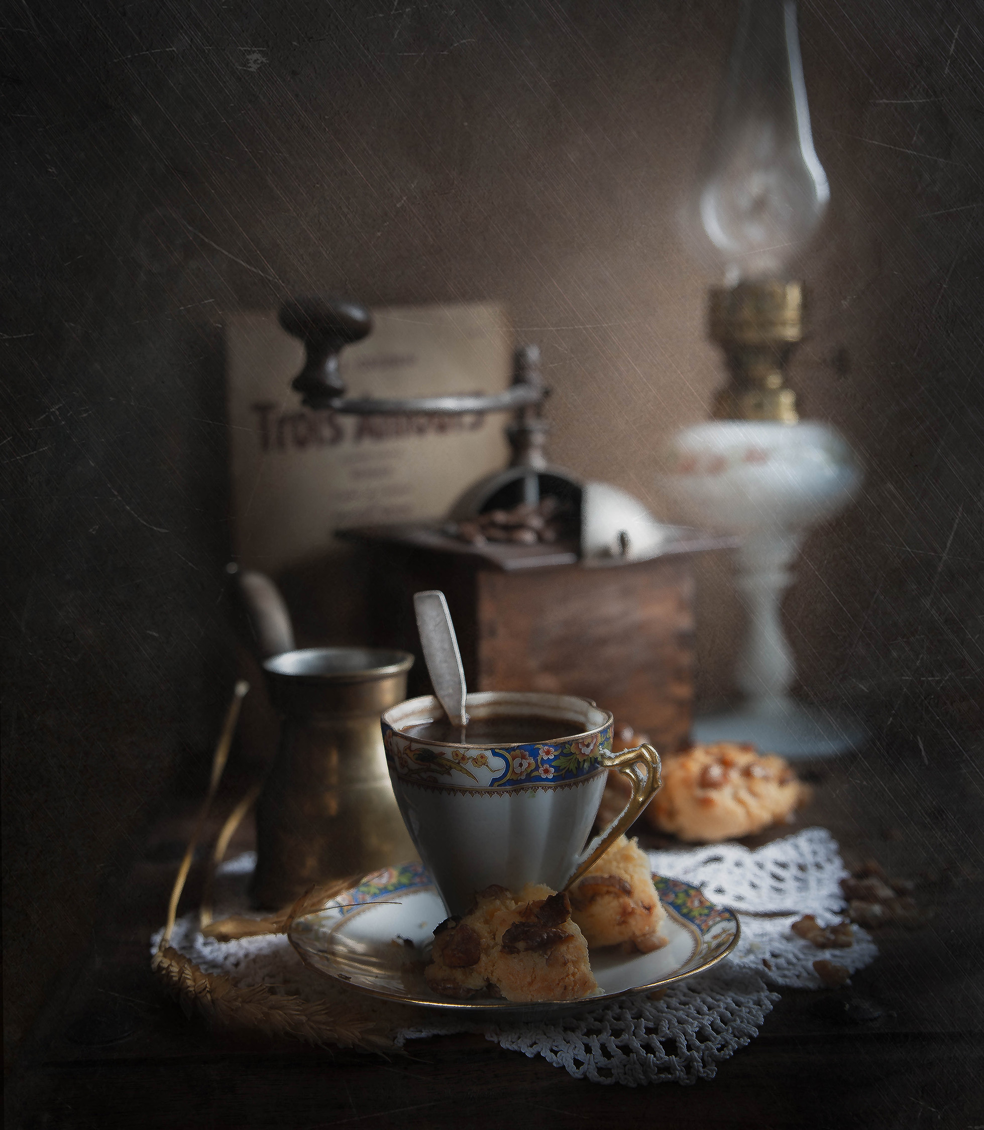 Light from the lamp spills soft, uneven—just enough to touch the rim, the lace, the crumbs.