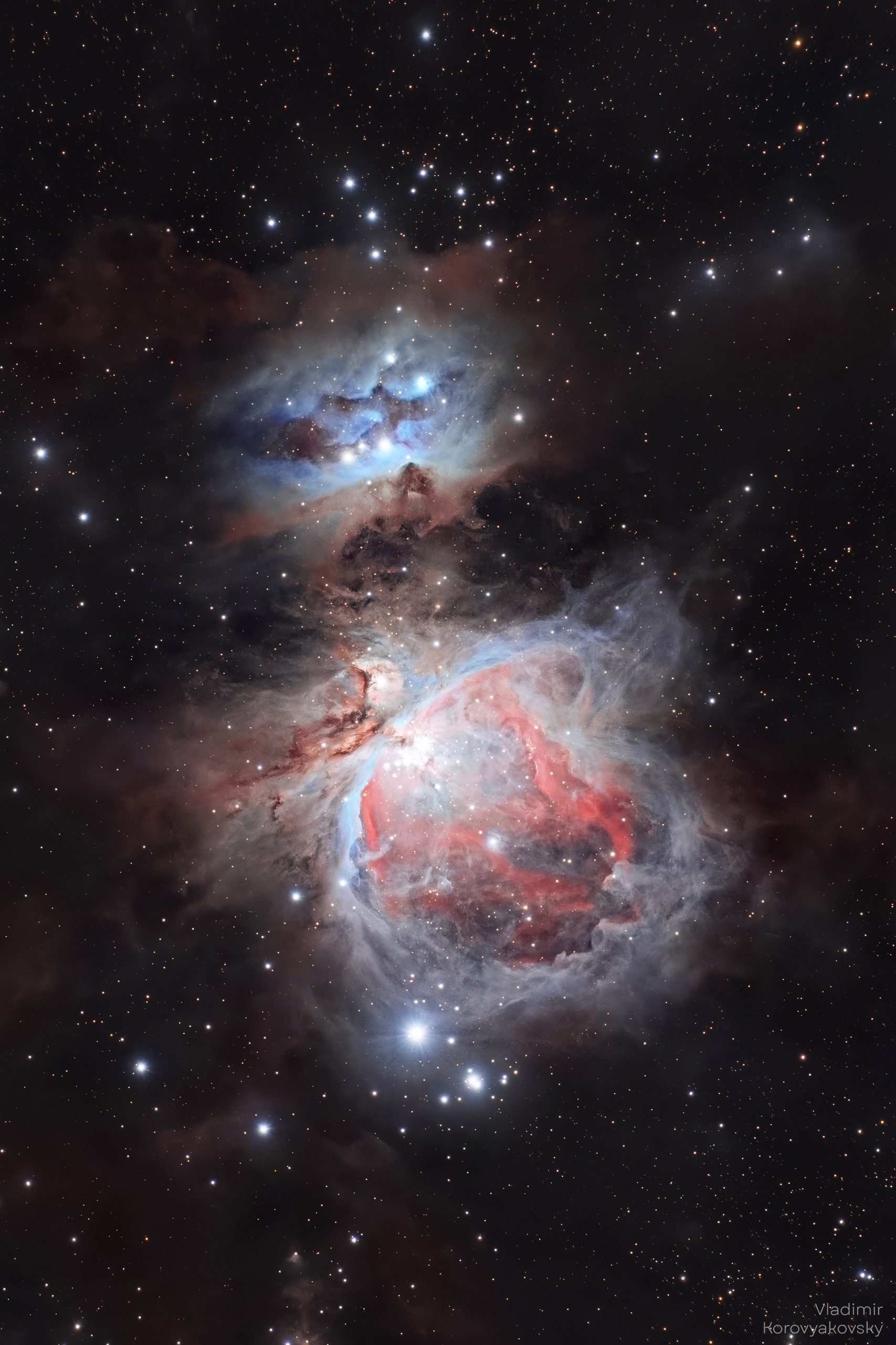 На этот раз выбрал область неба, которую снимал уже не единожды. Большая Туманность Ориона – самый популярный объект среди астрофотографов ввиду своей яркости, обширности и красоты. Находится в созвездии Ориона на расстоянии ~1400 световых лет. Сама туманность подсвечена молодым рассеянным скоплением звёзд \\\"Трапеция Ориона\\\", в котором происходит активное звёздообразование и ионизация газов.