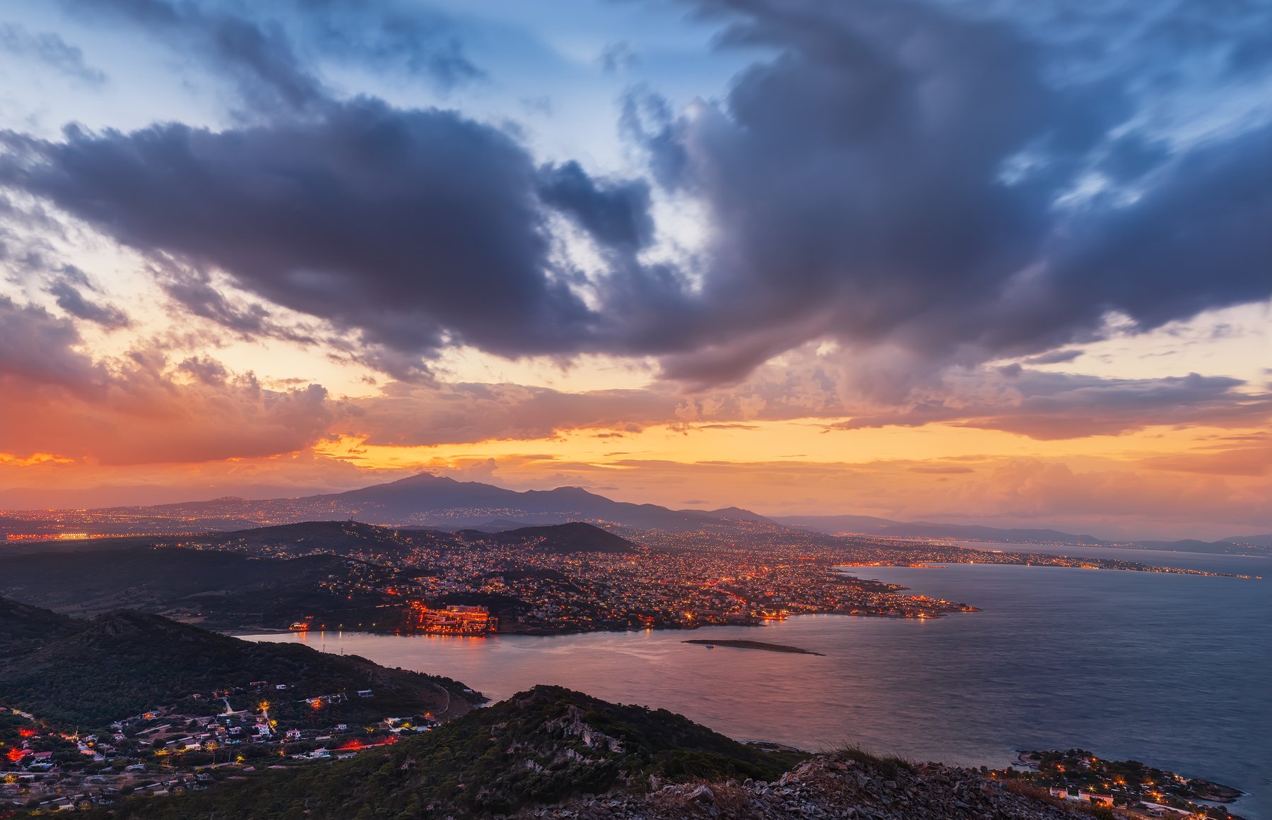 Панорамный вид городка Враврона и Эвийскеого залива на фоне заката.