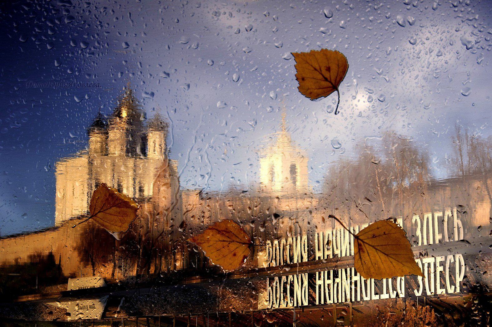 псков, россия, пейзаж, дождь, листья, стекло, через стекло, осень,собор, троицкий собор, Юрий Яковлев