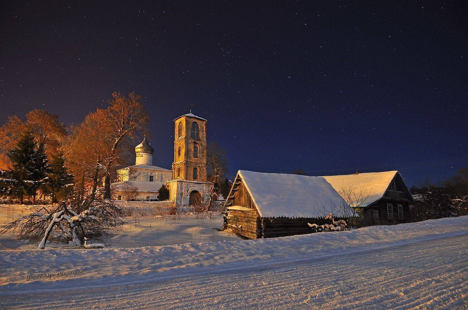 зима.ночь.деревня.церковь.звёзды.россия.псковская область