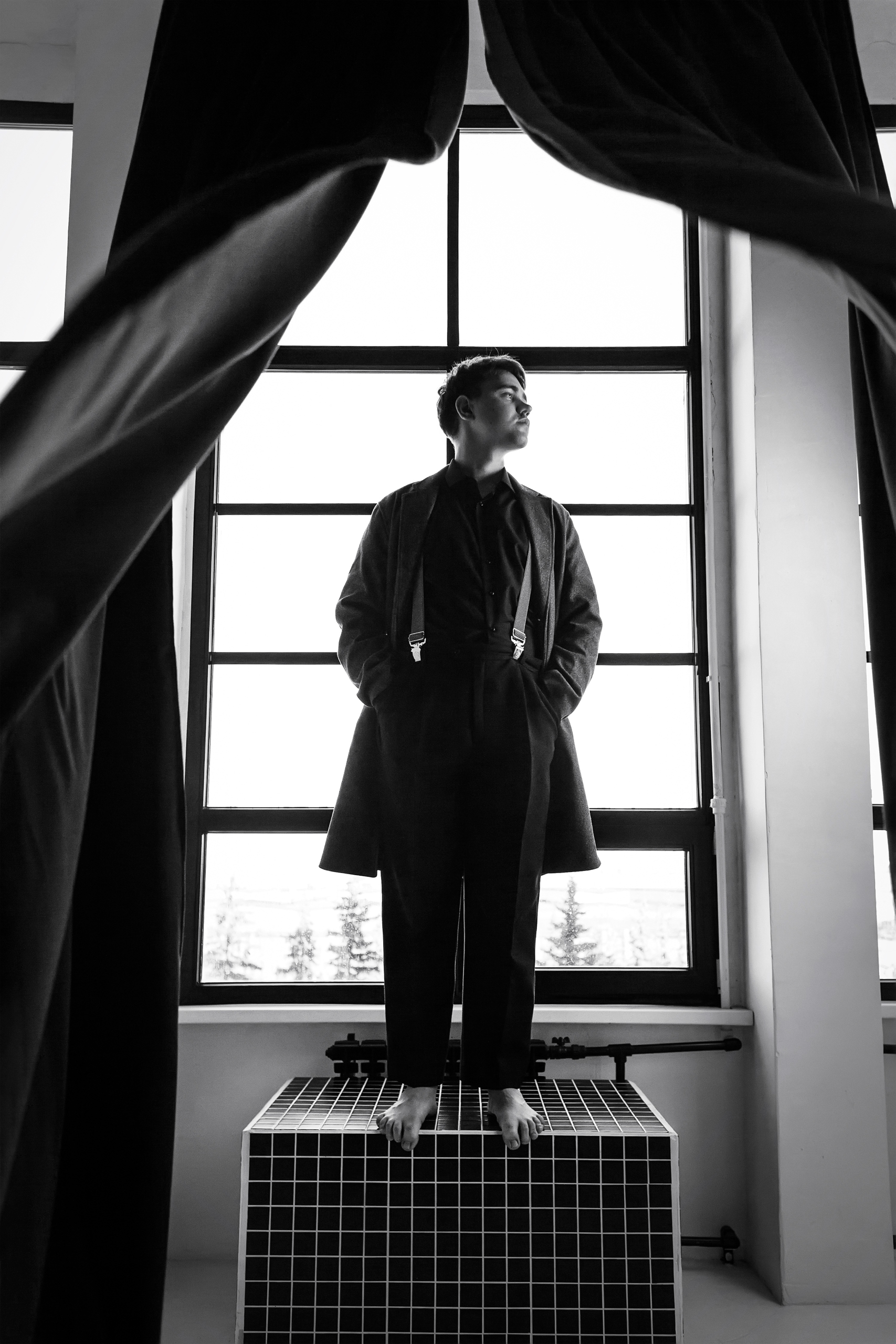 В этом чёрно-белом снимке мы видим мужчину, стоящего на ящике перед большим окном. Его силуэт выделяется на фоне света, создавая драматичную и стильную композицию. Фотограф Jankauskene Natalya мастерски использует контраст и тени для передачи настроения.