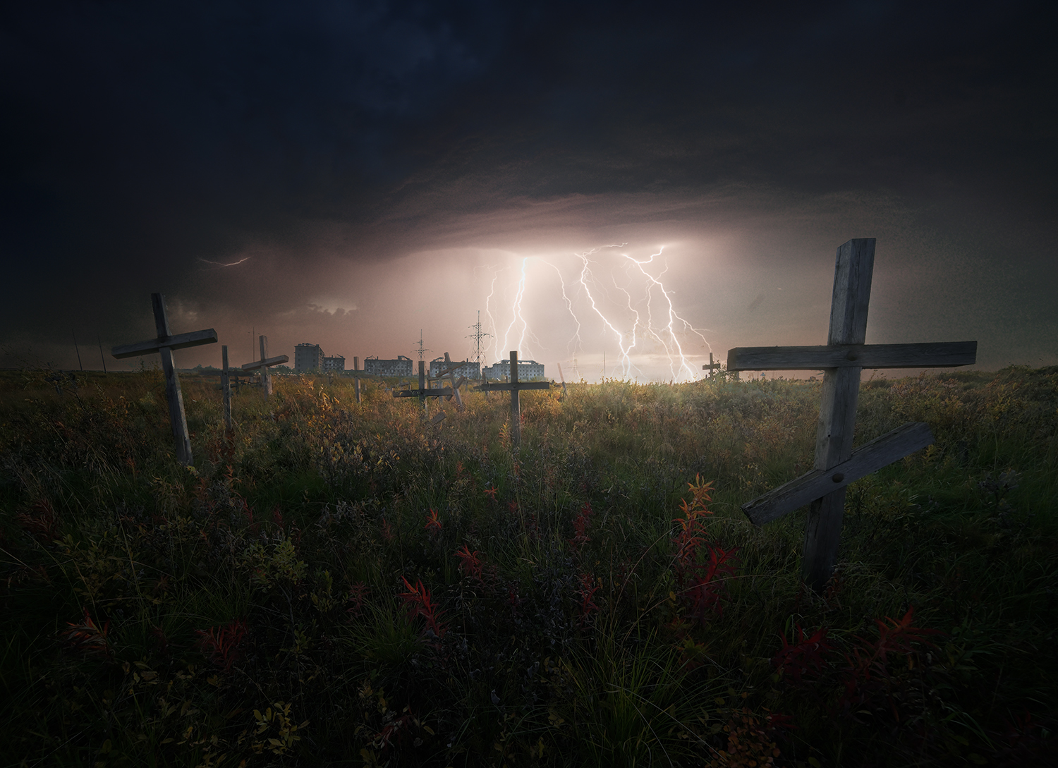Снимок получился неплохо — композиция устойчива, свет от молний подчёркивает силуэт крестов, фон с городом добавляет глубину. Тонировка и контраст удачны, атмосфера передана.