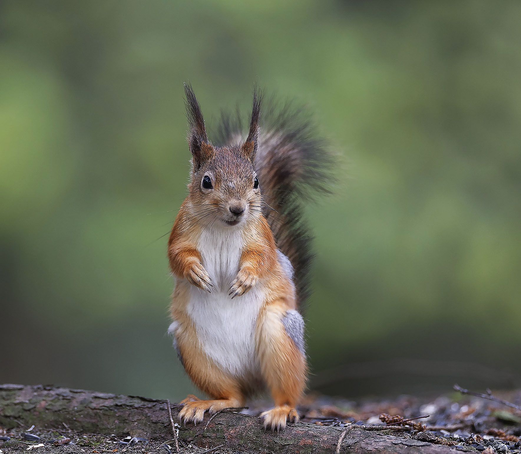 На фоне размытой зелени леса белка, встыв на задние лапы, словно в ожидании сигнала, смотрит прямо в объектив. Её пушистый хвост, поднятый вверх, и устремлённый взгляд передают тревожную бдительность. Каждая деталь — от светлой грудки до острых ушей — говорит о живом, необузданном мире природы. Фотография, сделанная Стукаловой Юлией, захватывает мгновение, когда животное становится не просто объектом, а хранителем тишины и гармонии леса. Это — красота, в которой нет места шуму.