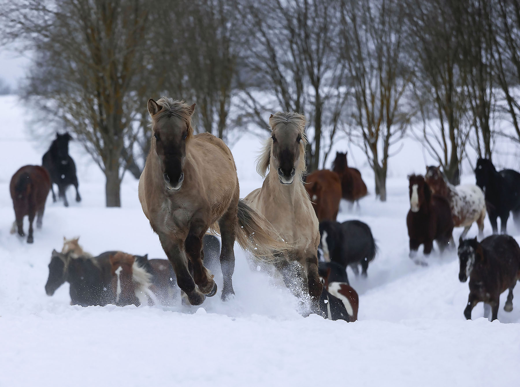 Вы хорошо передали динамику — лошади в движении, снег под копытами, чёткий фокус на передних животных. Композиция с глубиной, фон из деревьев не перегружает. Хорошо снято в условиях низкой освещённости.