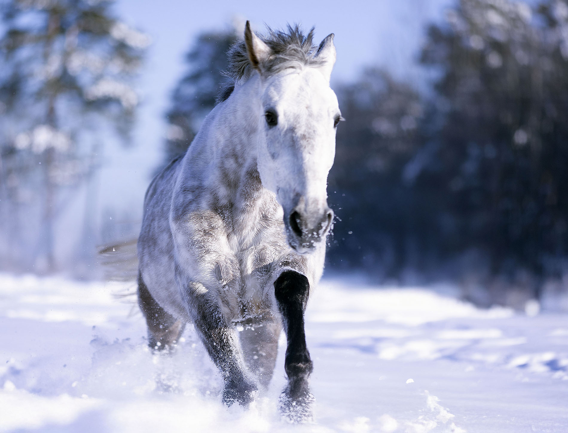 На фоне морозного леса белая лошадь несётся по заснеженному полю, поднимая облака снега. Каждый шаг — всплеск чистоты и мощи. Ветер развевает гриву, словно огонь в снежной тишине. Это не просто бег — это симфония природы, где сила и красота сливаются в едином порыве. Фотография передаёт дикую свободу и неповторимую атмосферу зимнего пейзажа.