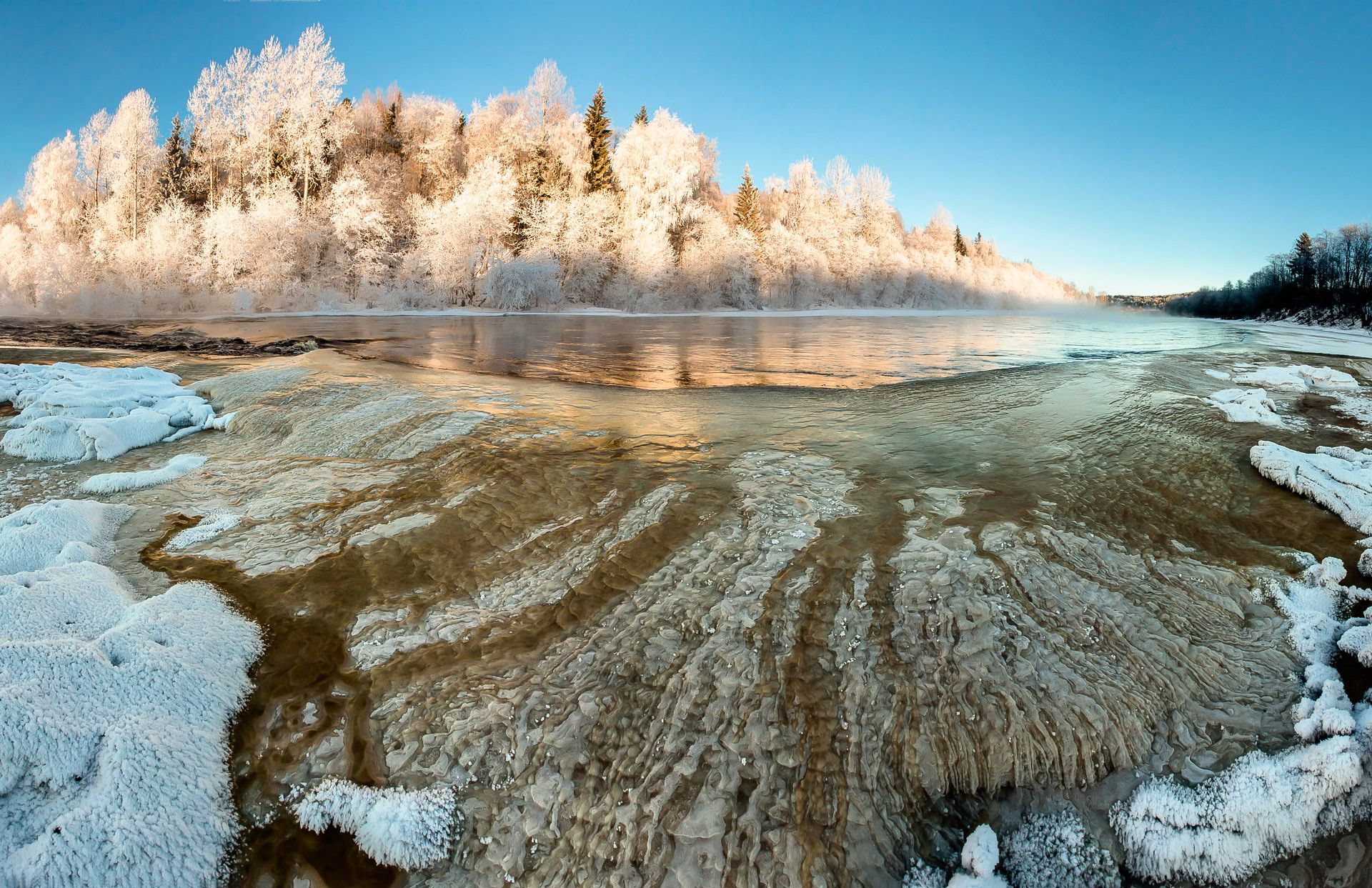Я стою на льду, покрывающим реку, но уровень воды передо мной - на метр выше моих валенок!