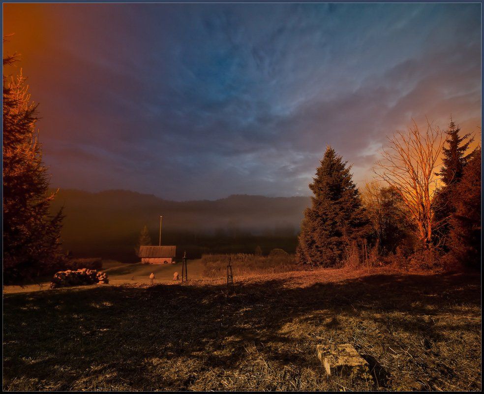 К этой картинке имеют отношение три натриевых фонаря: слева - над моим домом, справа - над соседским, а по центру - "баный" (этот хоть не горит...) :-)))