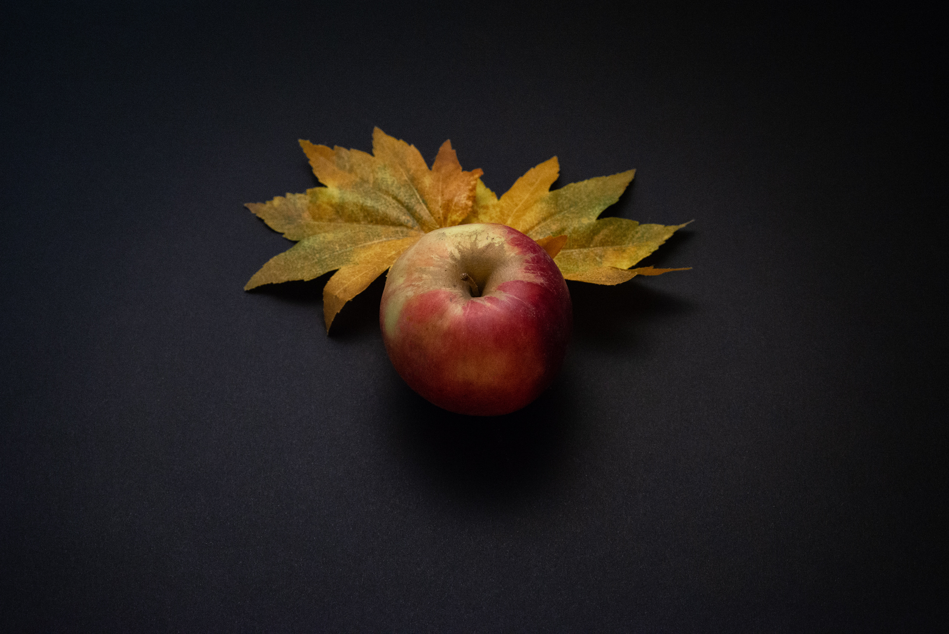 Юрий, снимок простой, но с чётким акцентом — яблоко и осенний лист на тёмном фоне. Цвета выделены, композиция спокойная.
