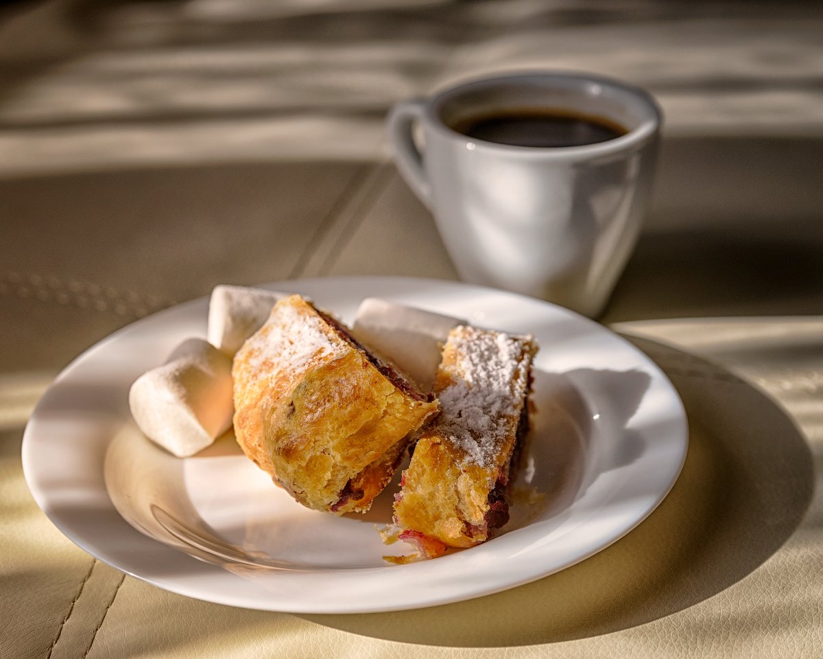 натюрморт, чашка, кофе, тарелка, маршмеллоу, штрудель, Юрий Диденко