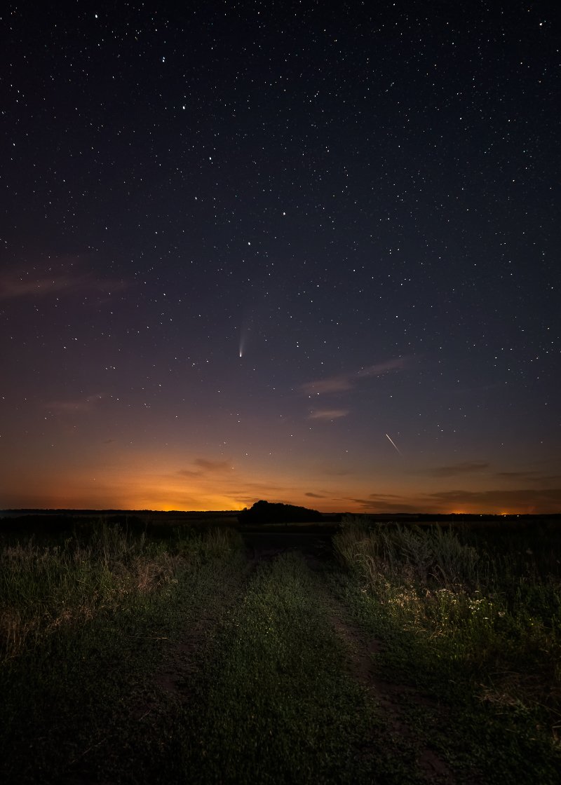 Комета c/2020 f3 (neowise) уютно расположилась на закатном небе под ковшом Большой Медведицы. Немного ниже и правее небольшой залётный метеор своим присутствием решил украсить пейзаж. И над всем этим, в правом верхнем углу, расположилась Полярная звезда - нерушимая точка небосвода, вокруг которой совершают свой неторопливый бесконечный путь "жители" северного небесного полушария.