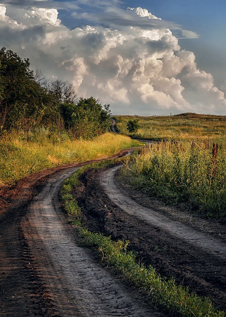 просёлочная дорога, дорога, облака, деревья, пейзаж, Юрий Диденко