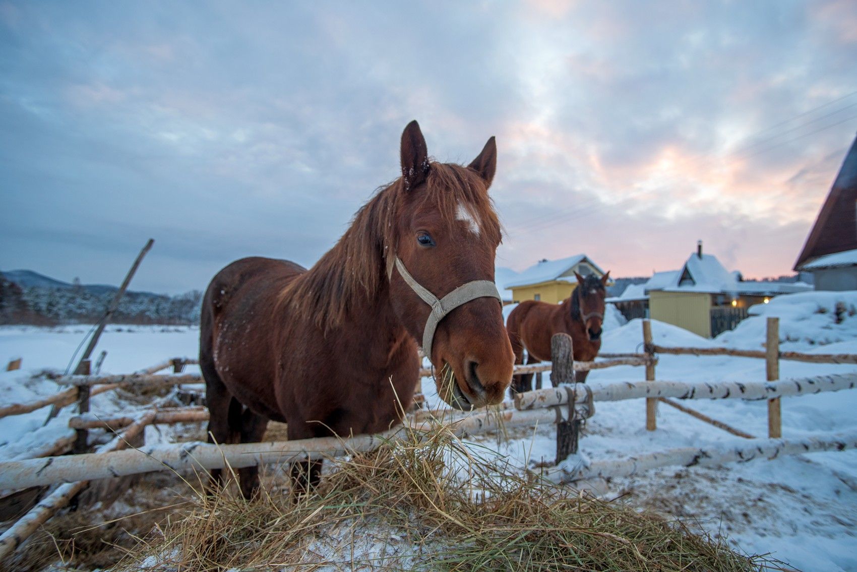 У второй лошадки видимо не было аппетита , такое же сено у неё было припасено.