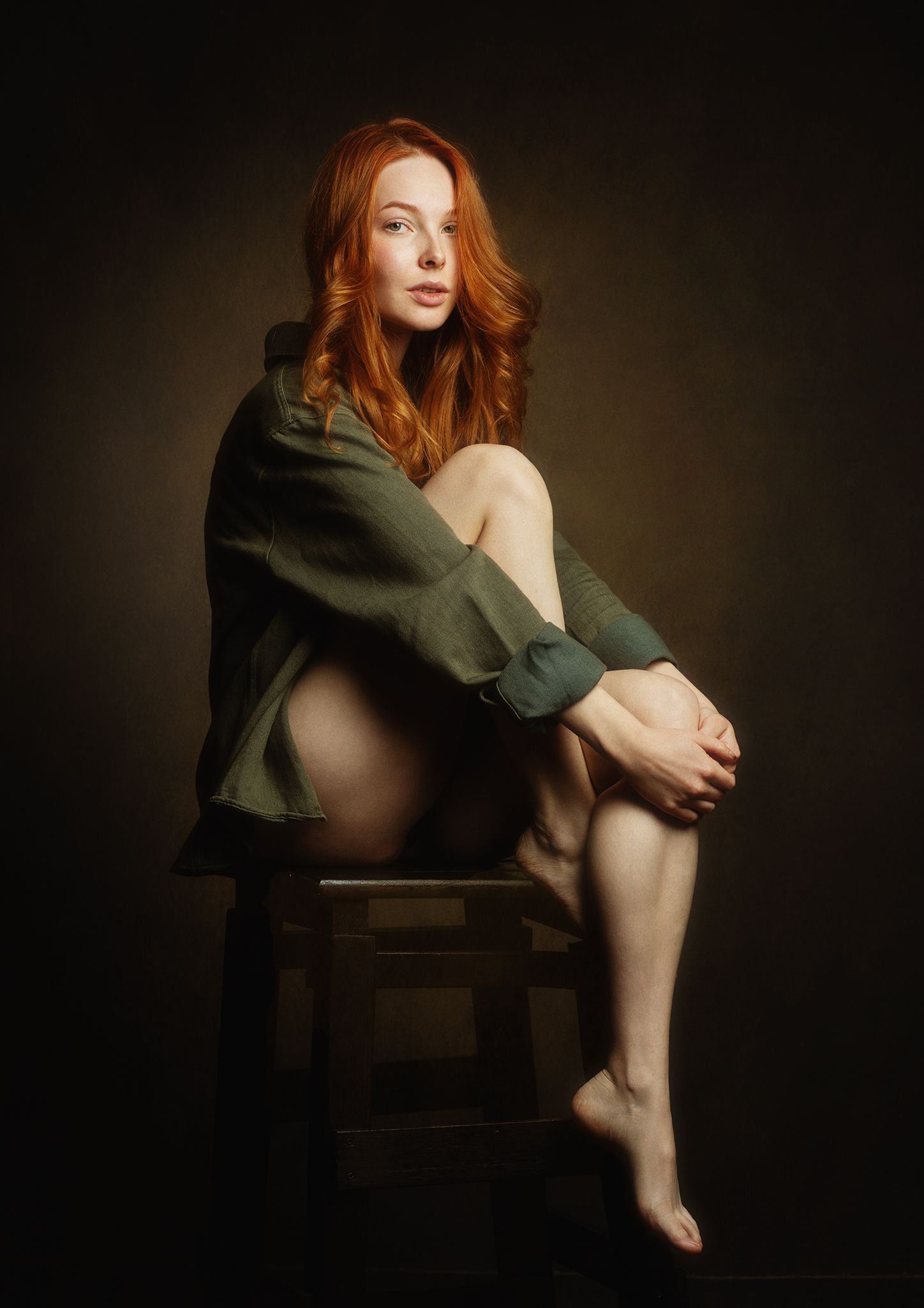 В тишине студии, окутанная полумраком, женщина сидит, скрестив ноги, в расстёгнутой зелёной рубашке. Её рыжие волосы падают на плечи, а взгляд — прямой, спокойный, почти задумчивый. Свет, как акцент, ложится на лицо и бёдра, подчёркивая контуры и текстуру кожи. Это не просто снимок — это мгновение внутреннего напряжения и уединения. Фотограф Zachar мастерски использует игру света и тени, чтобы передать глубину эмоций, не прибегая к словам. Каждый элемент композиции — от позы до цвета — говорит о силе, уязвимости и тишине, что делает портрет почти поэтическим.