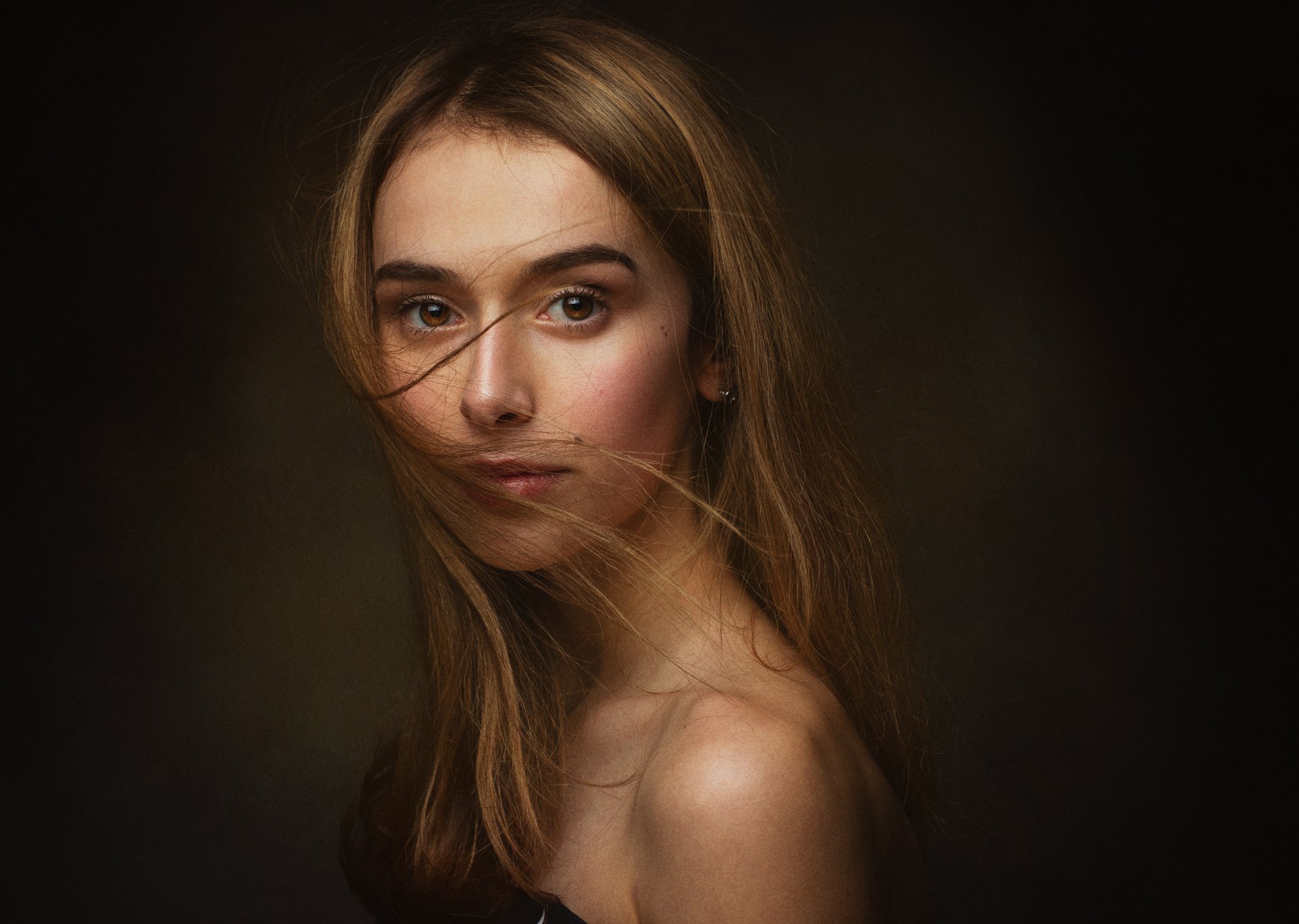 На снимке — молодая женщина, чьё лицо частично скрыто прядью волос, создающей ощущение движения и непосредственности. Тёмный фон и мягкий боке акцентируют внимание на лице и глазах, передающих сосредоточенность и внутреннюю силу. Свет, падающий сбоку, моделирует черты, подчёркивая текстуру кожи и глубину взгляда. Фотография передаёт атмосферу тишины и интимности, характерную для студийных портретов в жанре фотожурналистики. Работа фотографа Zachar демонстрирует мастерство света и композиции.