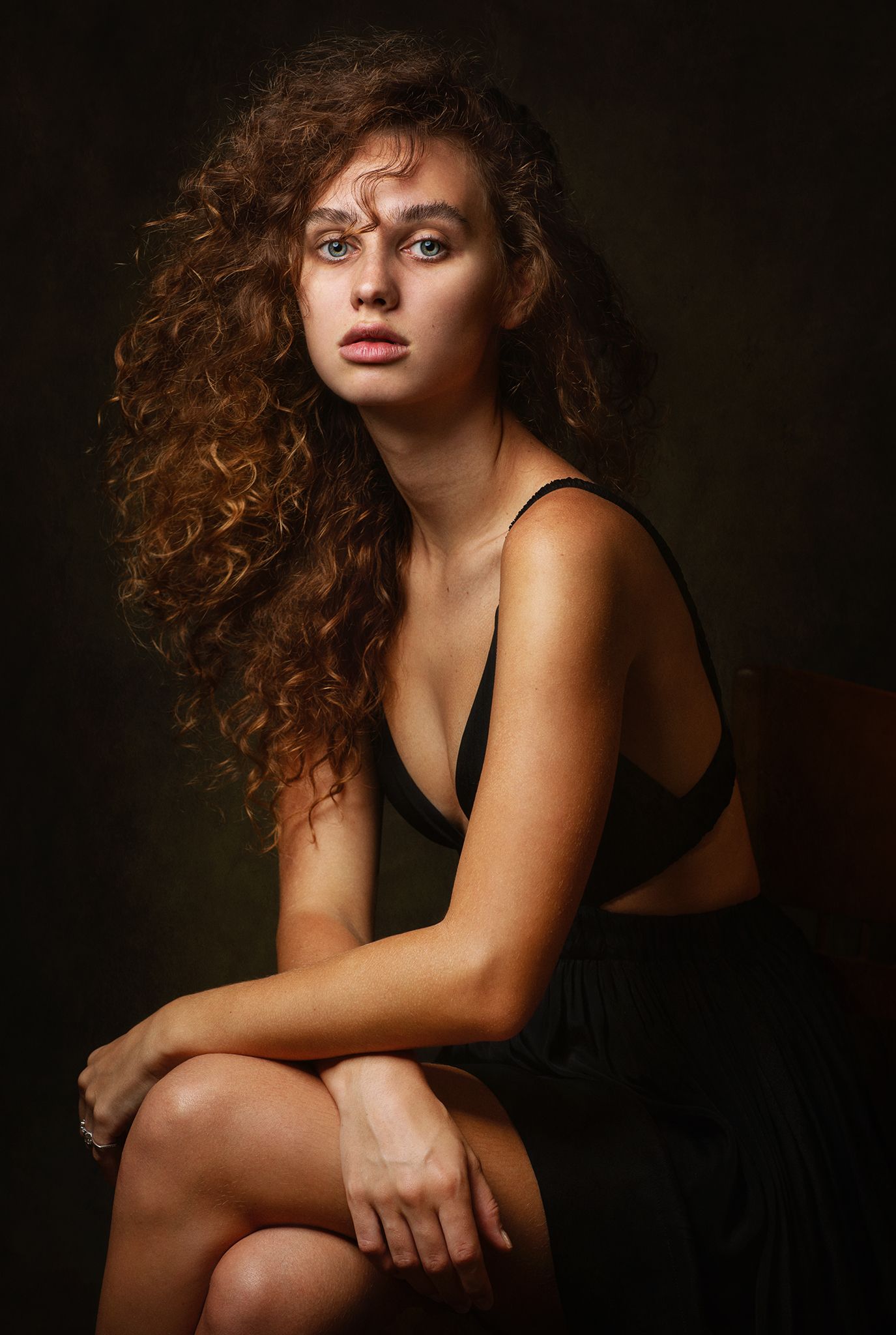 На снимке запечатлена женщина с густыми вьющимися волосами, сидящая в полутени. Её поза и выражение лица передают спокойную уверенность и внутреннюю сосредоточенность. Свет акцентирует контуры лица и шеи, подчеркивая элегантность образа. Фотография выполнена в классическом стиле студийного портрета, где игра света и тени создаёт глубину и драматизм.