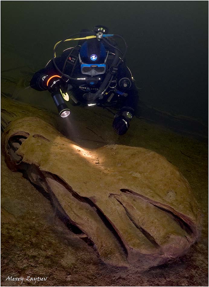 А если серьезно, то там под водой много уавших с берега деревьев, в основном лиственниц. Корни и стволы бывают очень причудливых форм... Вода прозрачная, но очень темная. На глубине 30 метров, днем, темно как в Египте, на ночном дайве. Мрачно и страшно, как в Мордоре...