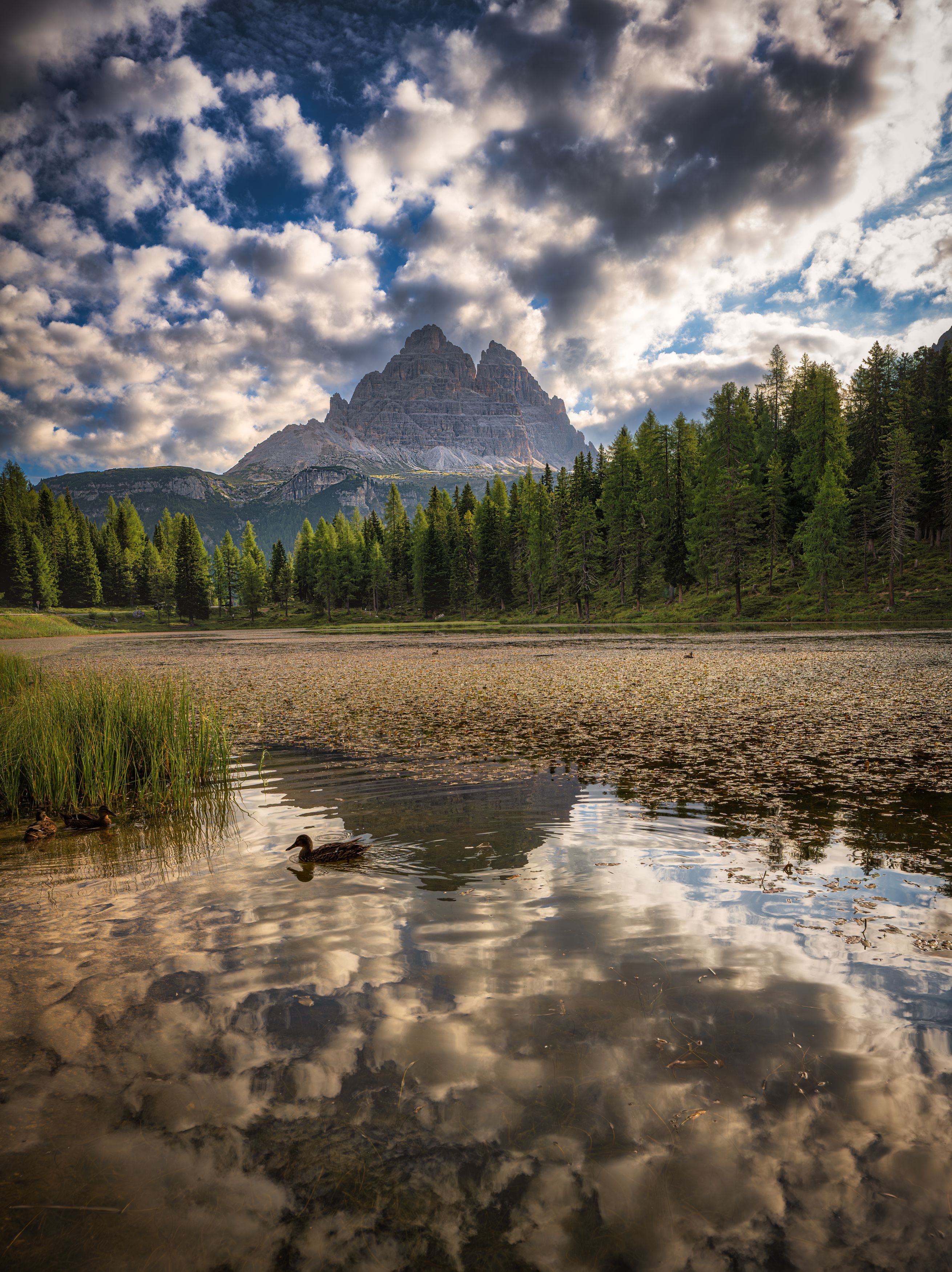 The mountain rises cleanly from the treeline, its sharp edges mirrored in the still water below. Clouds fracture the sky, their reflections softening the surface like a second sky. A single duck drifts through the calm—small, deliberate, undisturbed. The light is even, the frame balanced. It feels complete.