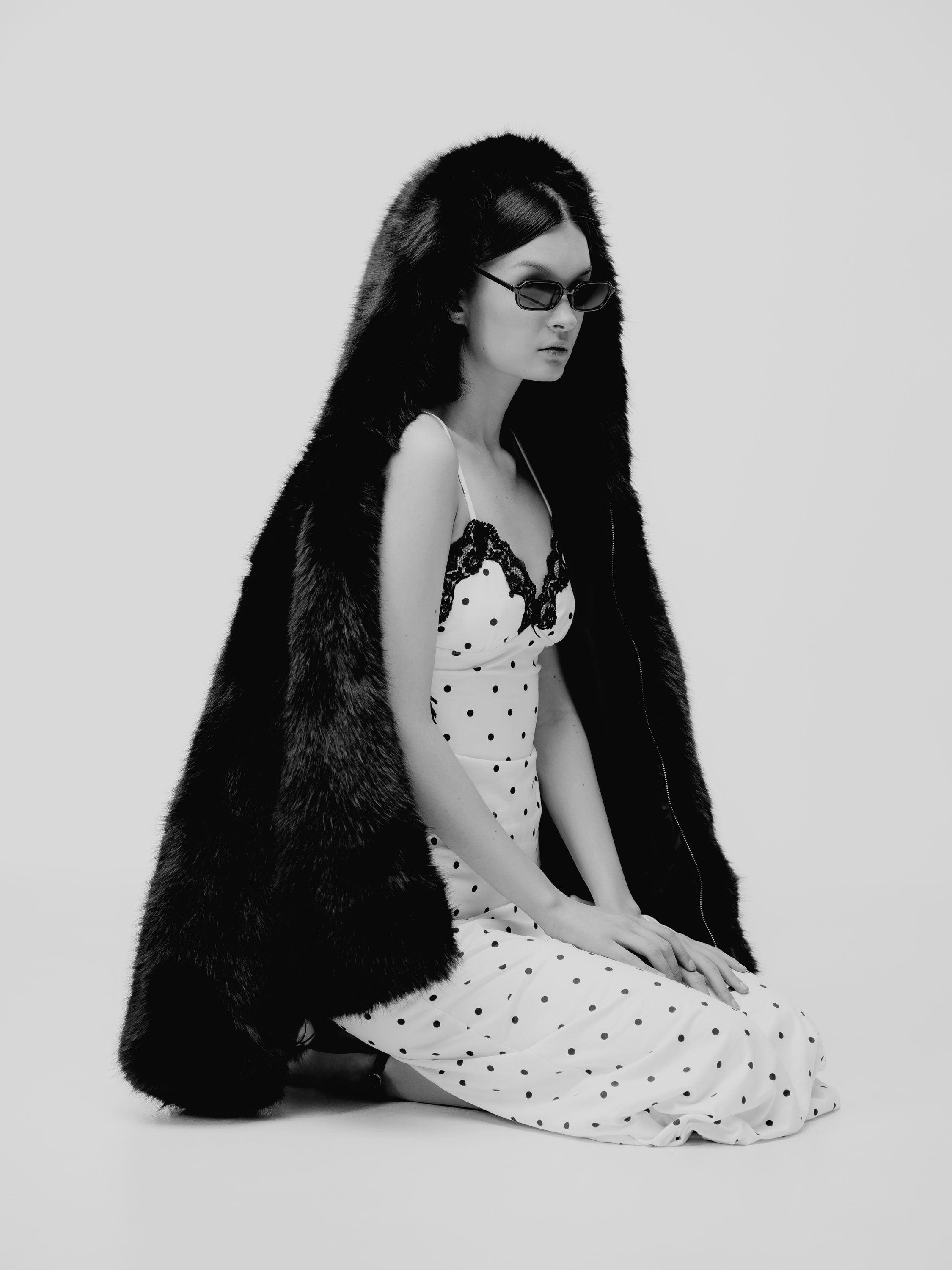 Чёрный мех, белое платье с горохом, солнцезащитные очки — всё это работает как единое целое.