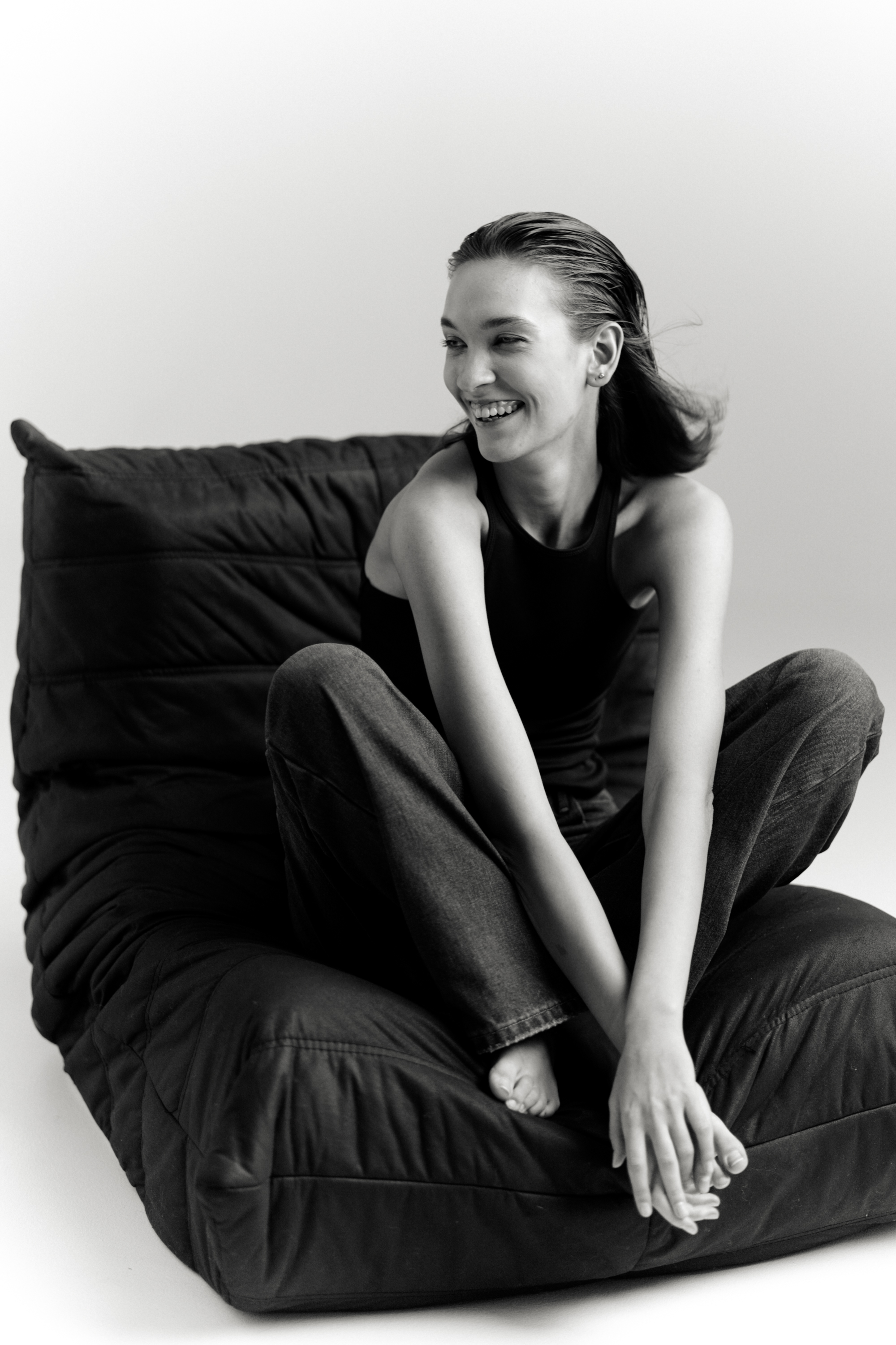 Фотография выполнена в чёрно-белом ключе, с акцентом на контраст между тёмным диваном и светлым фоном. Композиция выстроена с учётом линий тела модели и пространства, что создаёт ощущение устойчивости и равновесия.
