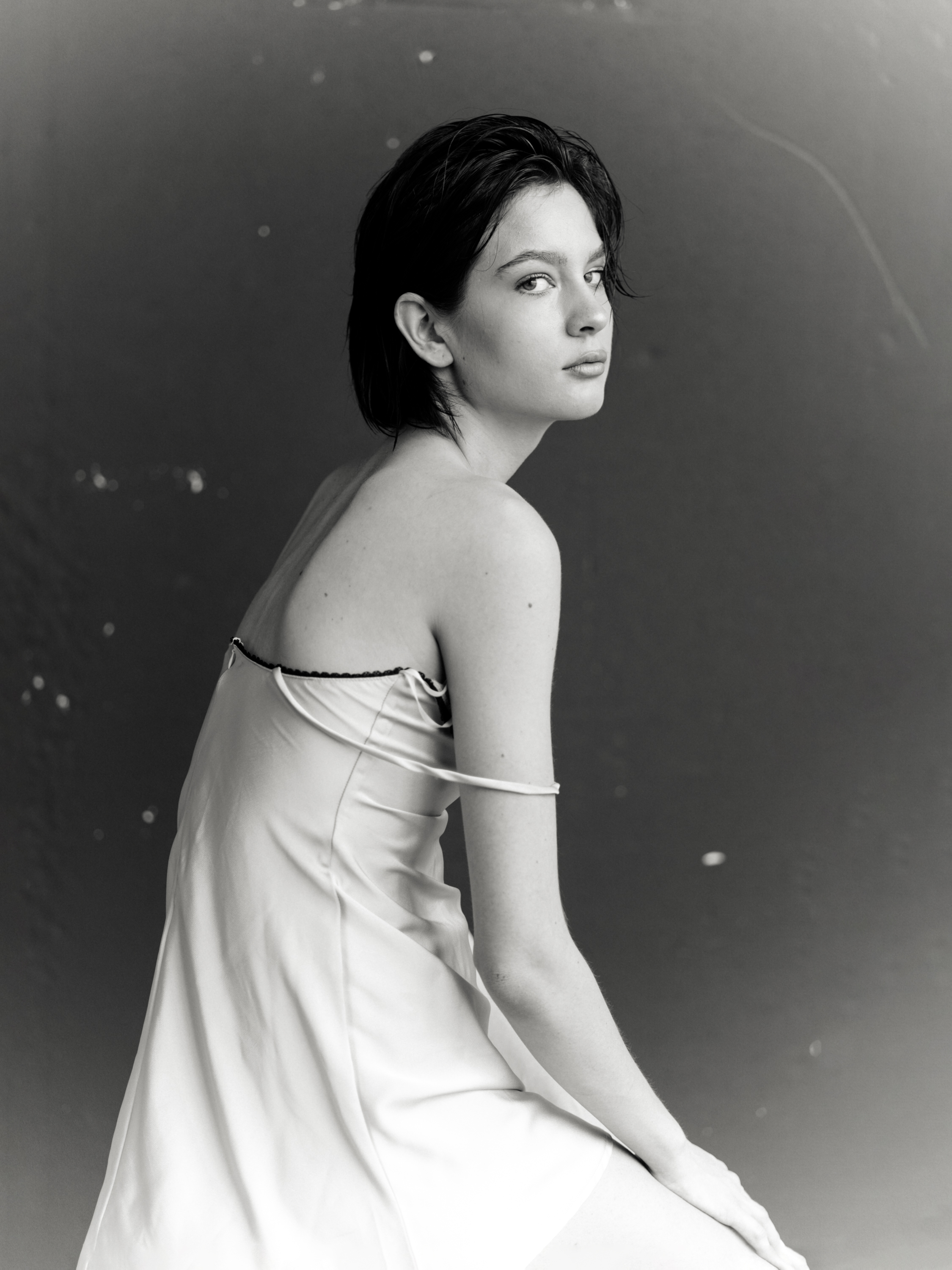 В этом черно-белом портрете молодая женщина изображена в профиль, её взгляд устремлен вдаль. Она одета в легкое платье с тонкими бретелями, которое подчеркивает ее изящные линии. Фон напоминает ночное небо со звездами, создавая атмосферу таинственности и мечтательности. Фотография выполнена Павлом Зайковым, мастером световых эффектов и композиции.