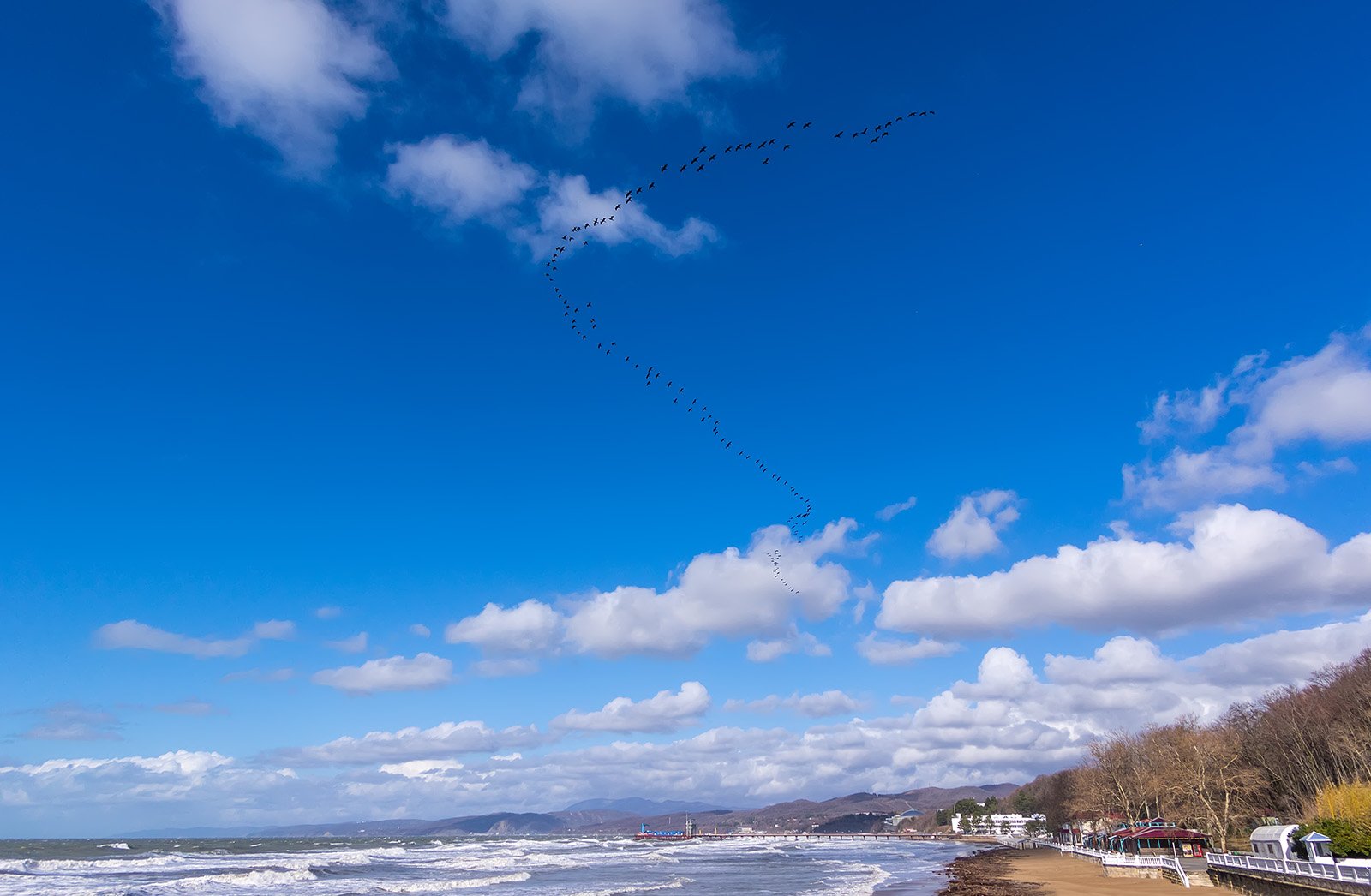 природа, пейзаж, море, небо, облака, горизонт, птицы, косяк, Александр Земляной