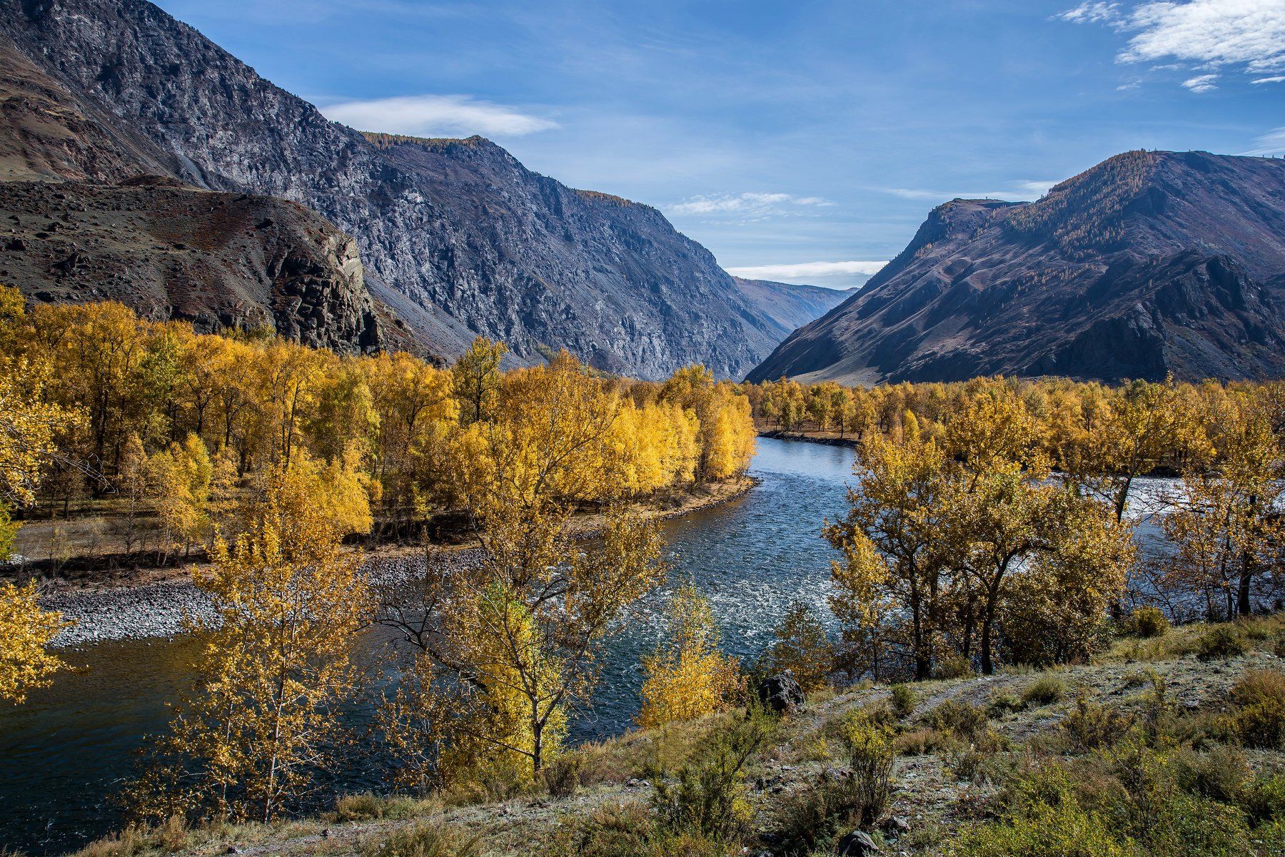 Горный Алтай Вытекает из заболоченной местности к юго-востоку от высокогорного озера Джулукуль на высоте 2200 м, и впадает в Телецкое озеро, являясь крупнейшим его притоком. При впадении в озеро образует дельту с протокой Чебачья и о. Камаин[2], ставшего с конца ХIХ века одним из оазисов сибирского садоводства и виноградарствa ввиду своего мягкого климата[3]. Длина — 241 км, площадь бассейна — 16 800 км²[4]. Ширина в среднем течении — 30—50 м, глубина — около метра. Протекает по малообитаемым местам. На Чулышмане расположены сёла Коо и Балыкча. Вдоль реки, через эти сёла, проходит автомобильная дорога от устья Чулышмана до перевала Кату-Ярык, и далее — через сёла Балыктуюль и Улаган в Акташ, с выходом на автодорогу М-52 «Чуйский тракт». Вода холодная, мутноватая, с голубым или зелёным оттенком.