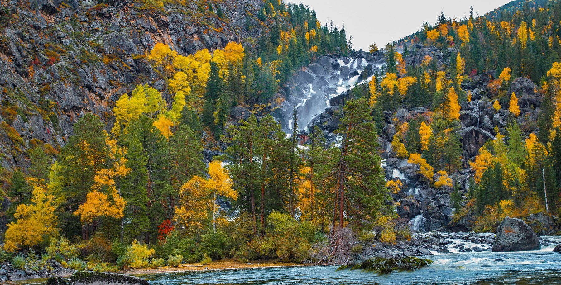 Горный Алтай. Большой Чульчинский водопад, или Чульчинский, или Учар (южноалт. «летящий» или «неприступный») — каскадный водопад на реке Чульча на востоке Алтая. Административно расположен в Улаганском районе Республики Алтай, на территории Алтайского заповедника. Является самым большим в регионе, имея высоту падения около 160 метров.