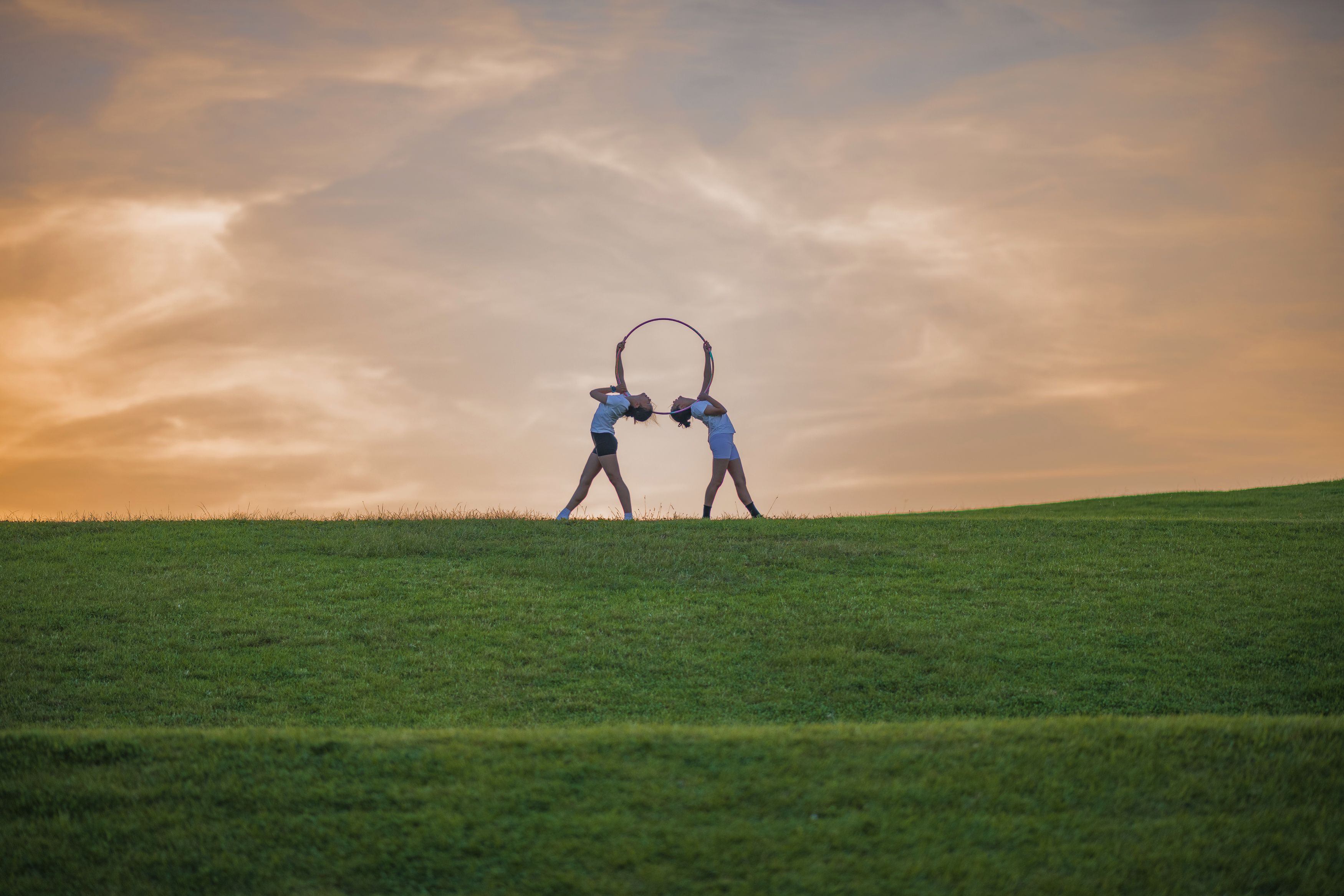 Nice composition with the subjects forming a circle against the sunset sky. The lighting is soft and even, which complements the serene mood of the scene well. Good choice of timing for the golden hour effect.