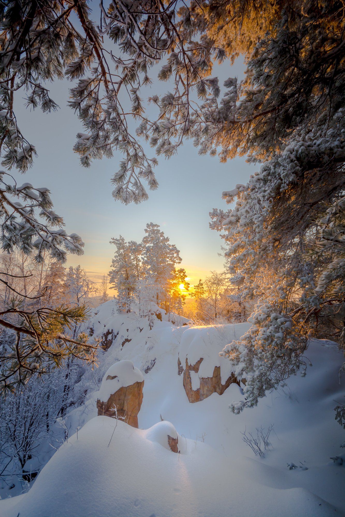 лес скалы мороз закат урал снег солнце, Жданов Дмитрий