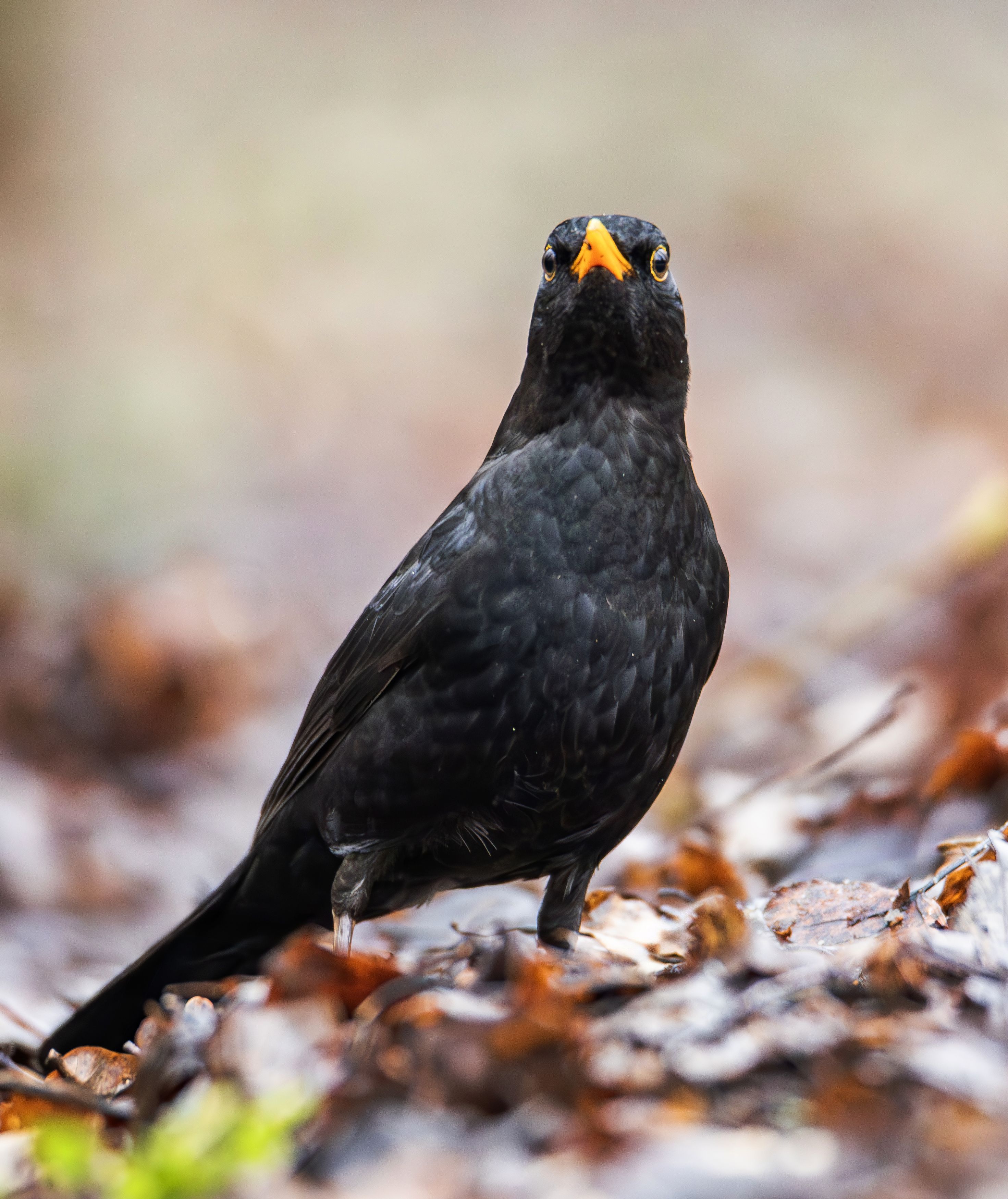 На снимке запечатлён чёрный дрозд (Turdus merula) — одна из самых узнаваемых птиц Европы и Азии. Птица стоит среди опавшей листвы, внимательно глядя в объектив. Яркий жёлтый клюв и глаза создают контраст с чёрным оперением. Фотография сделана в апреле в Бирюлёвском дендропарке, где можно наблюдать за птицами Москвы. Это отличный пример фотоохоты, позволяющий рассмотреть детали живой природы.