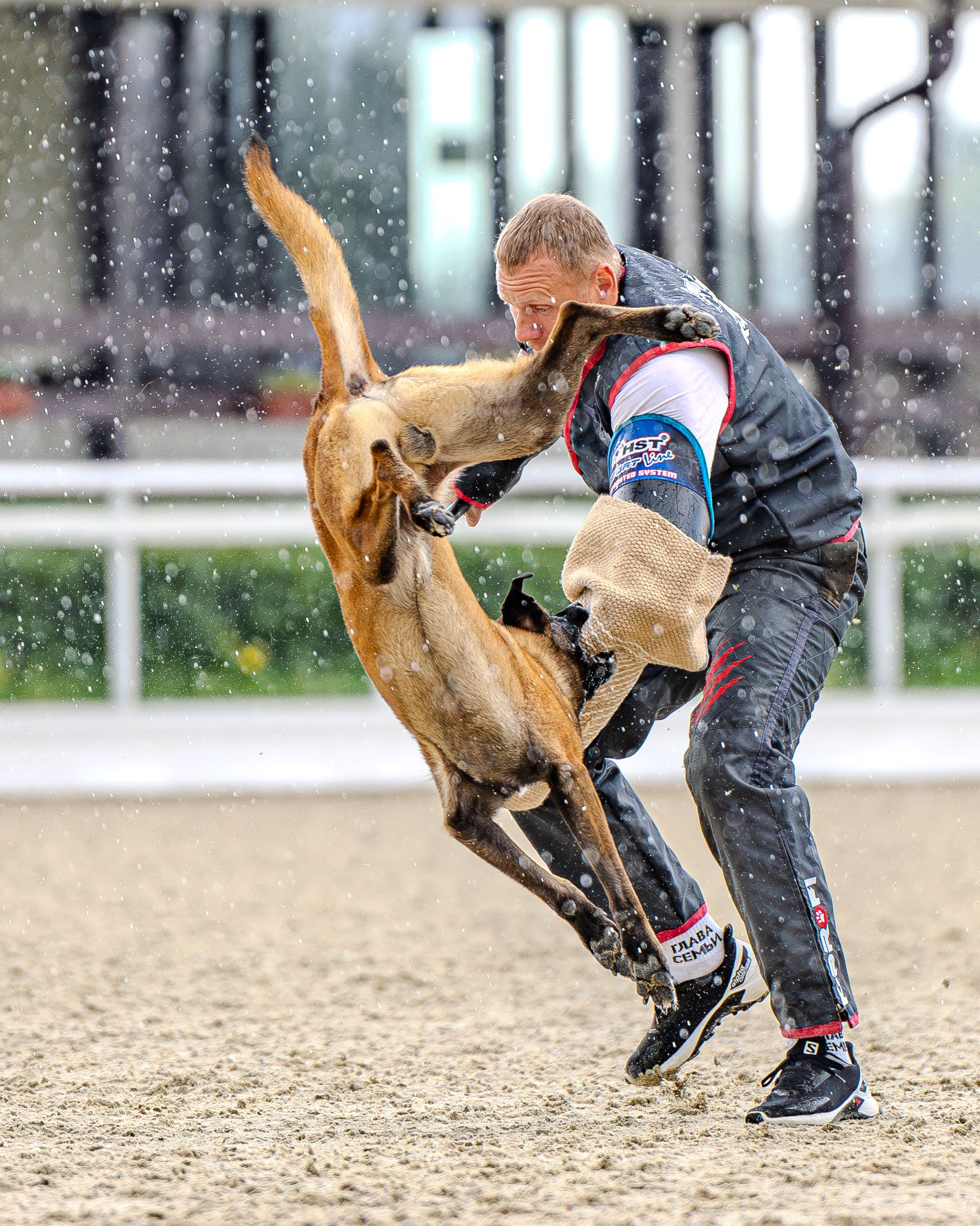 Это соревнования по спортивно-прикладному собаководству (Служебное троеборье IGP). Защитный раздел в этом виде спорта очень динамичный, на больших скоростях. В дождь не останавливают соревнования, и вот результат. Спасибо
