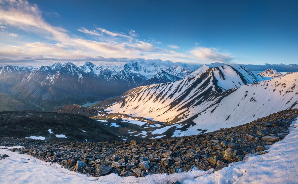 Фото сделано с горного перевала Каратюрек, 3060 м над уровнем моря, вдали виднеется Аккемская стена и г. Белуха, самая высокая вершина Сибири. Алтай, июнь 2014.