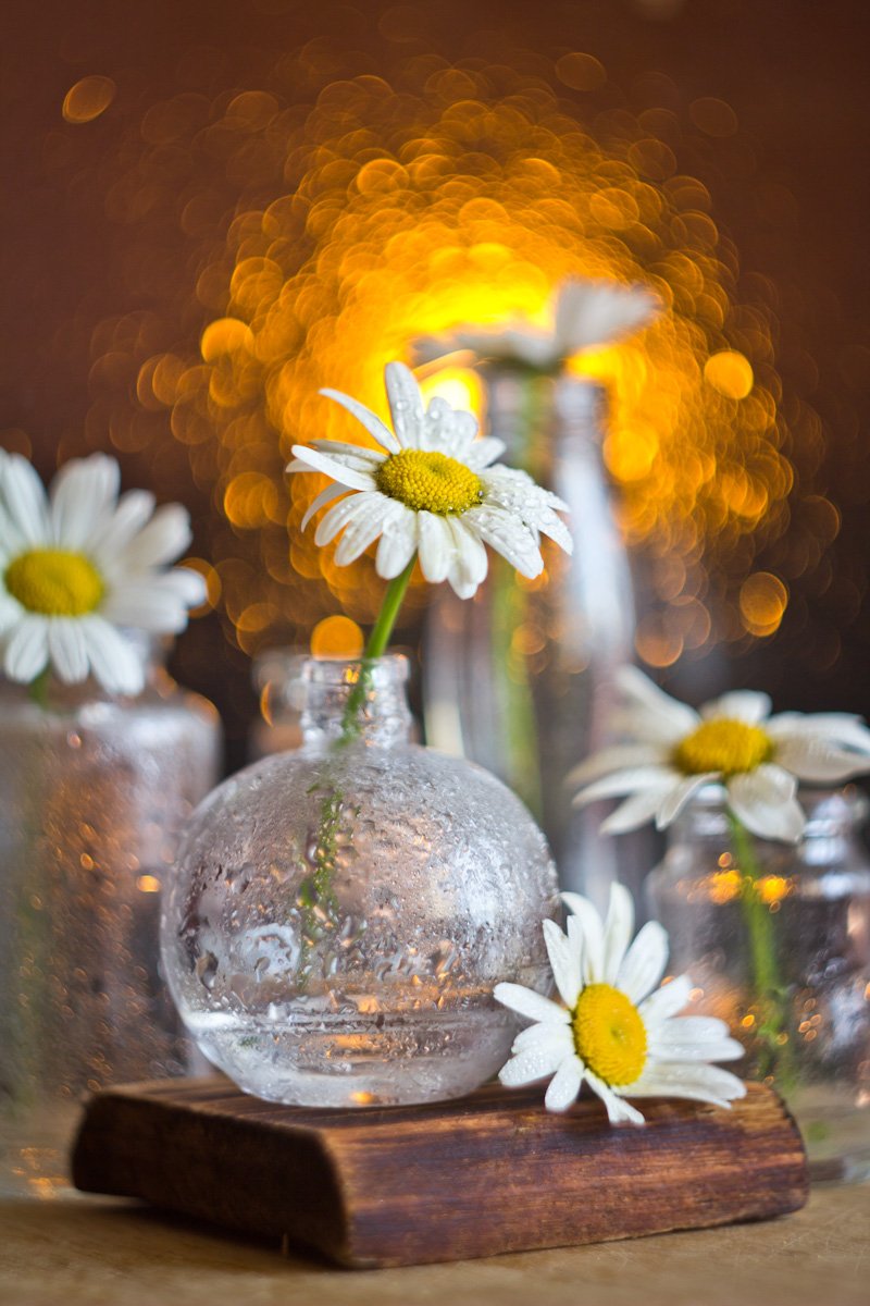 ромашки, натюрморт, боке, цветы, брызги, вода, закат, солнце, бутылки, банки, стекло, красивый, лето, still life, Алла Семенова