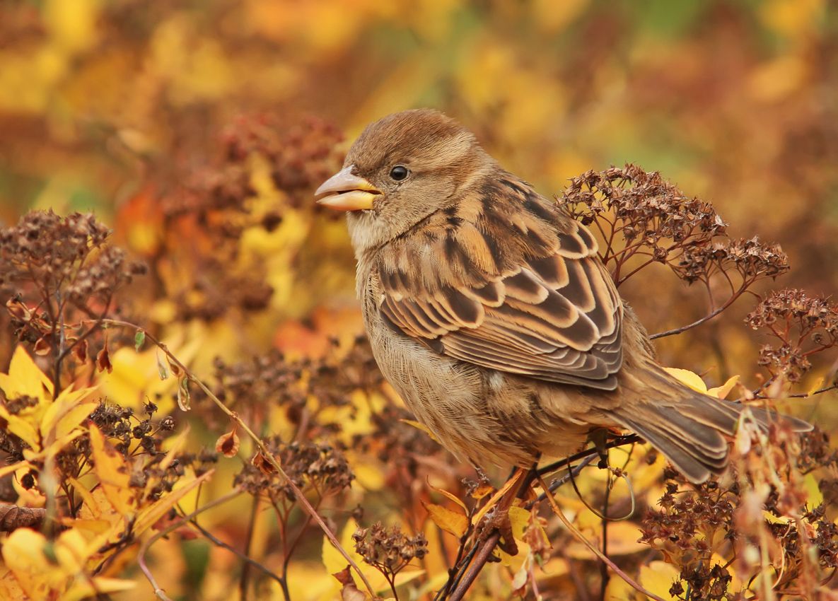 Помилуйте, какая жара...Ноябрь месяц! :) Если клюв с большущей лупой разглядывать, то можно на язычке семечко увидеть, которое воробьишко пытался расщелкнуть. От усердия язык высунул. :)