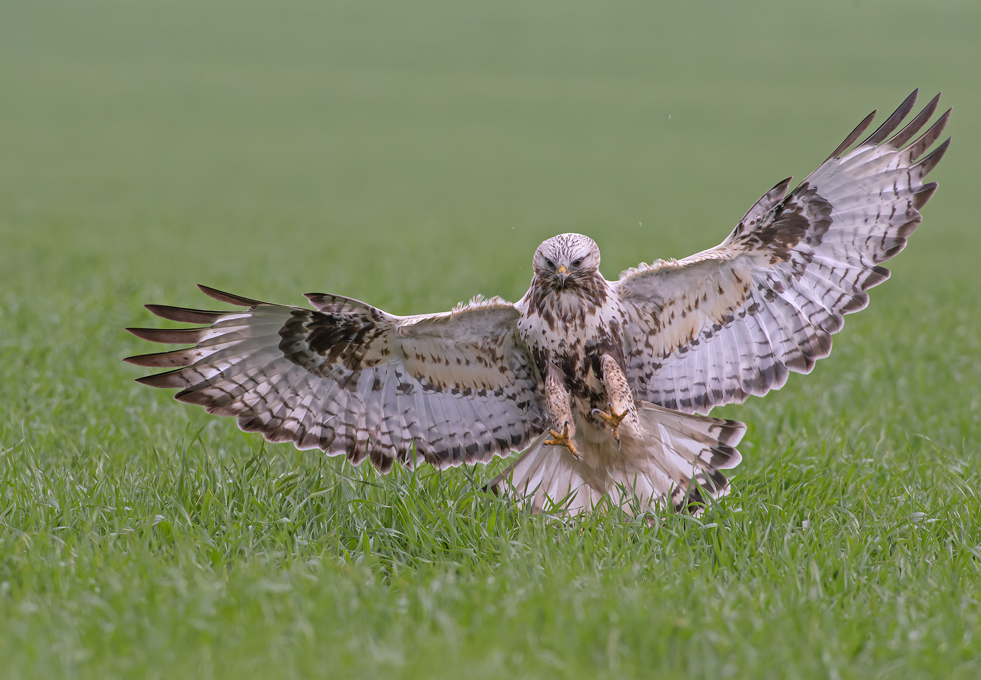 На снимке запечатлён сокол в финальной фазе посадки — крылья широко раскрыты, лапы опущены, готовые к приземлению на зелёный луг. Текстура перьев и травы передаёт ощущение живой природы. Фотография отражает точный момент, когда птица перехватывает воздух, удерживая равновесие. Свет мягкий, что подчёркивает детали оперения. Работа Сергея Златкова демонстрирует мастерство в захвате динамичных сцен дикой природы.